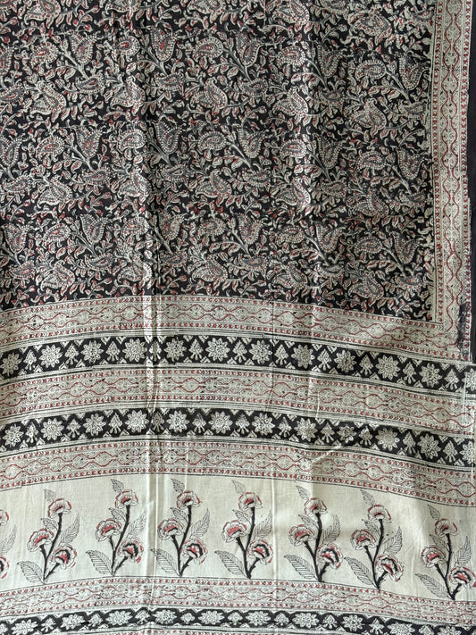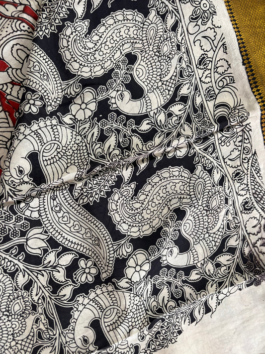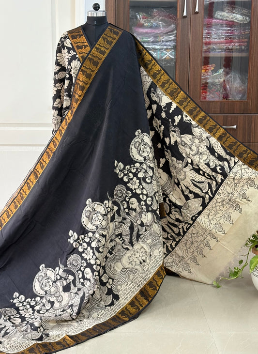 Pen Kalamkari hand painted Mangalgiri Silk black and white Saree with blouse