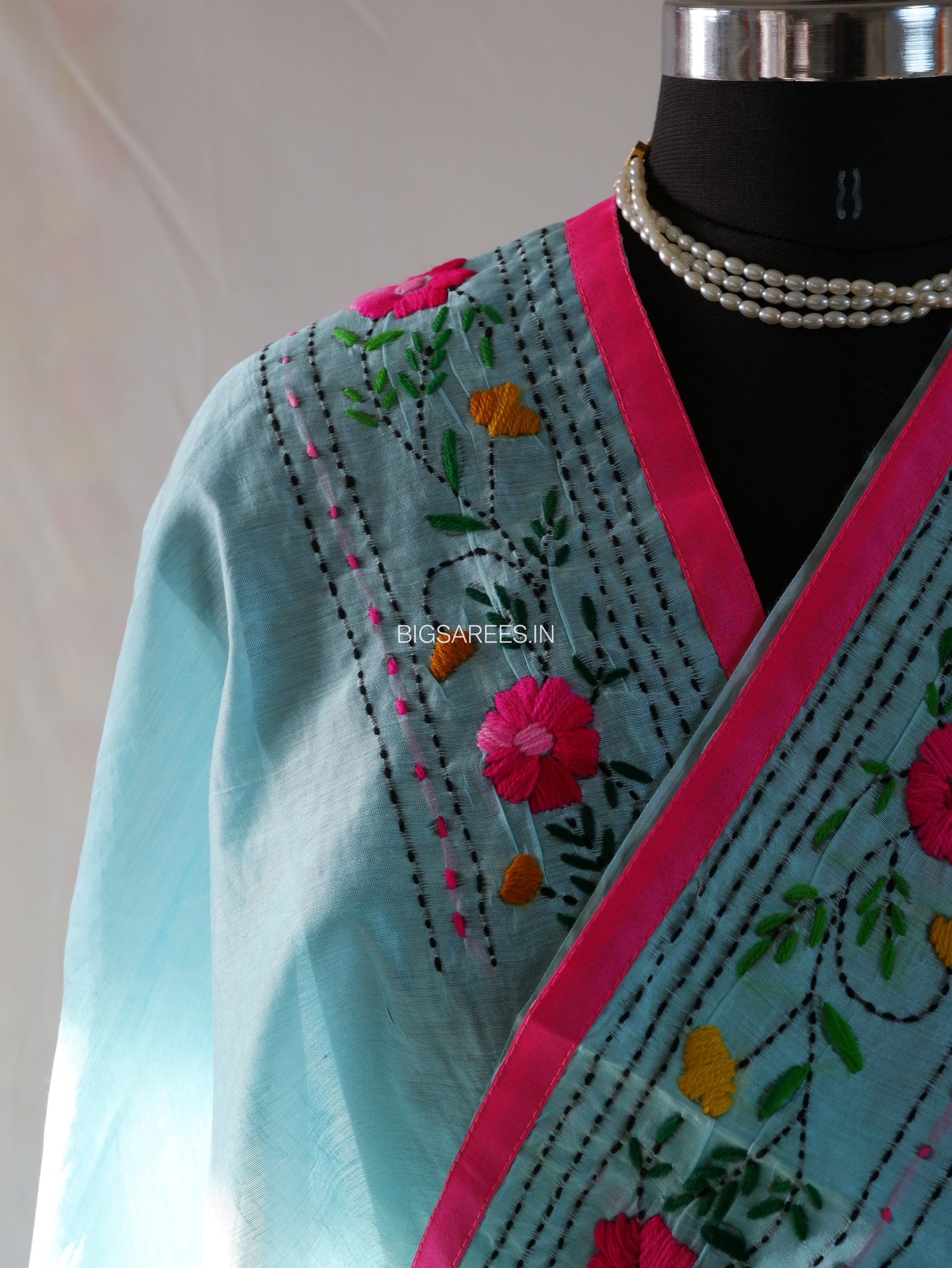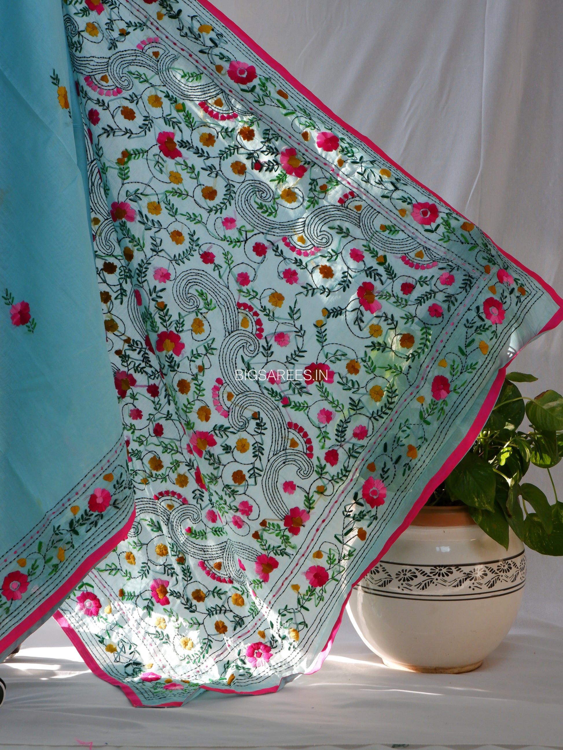 Phulkari Hand-Embroidered Saree | Chanderi Silk | Sky Blue