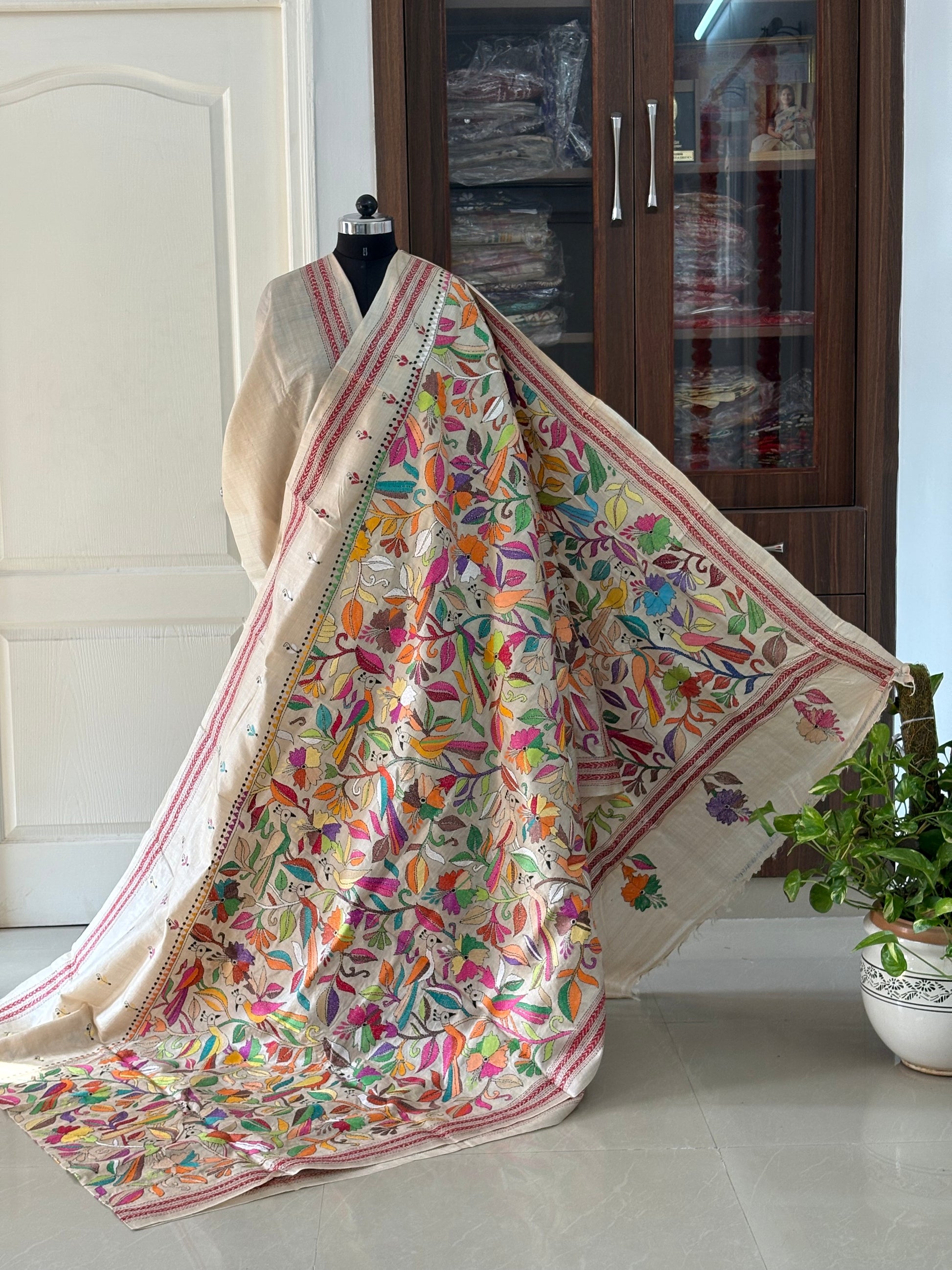Kantha Stitch Hand Embroidered Pure Gachi Tussar Silk Saree (Silk marked)
