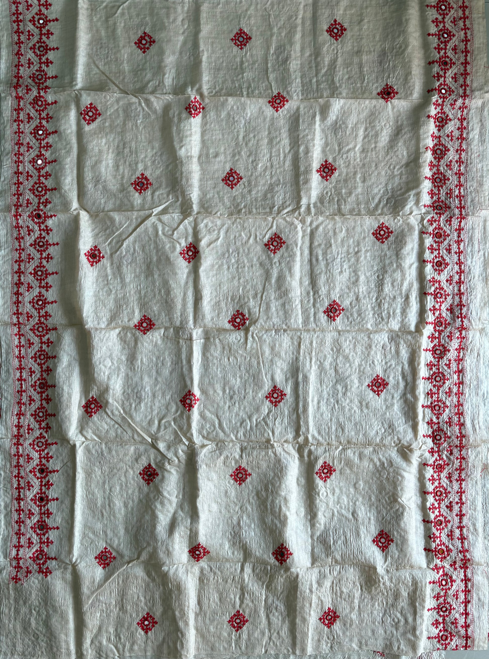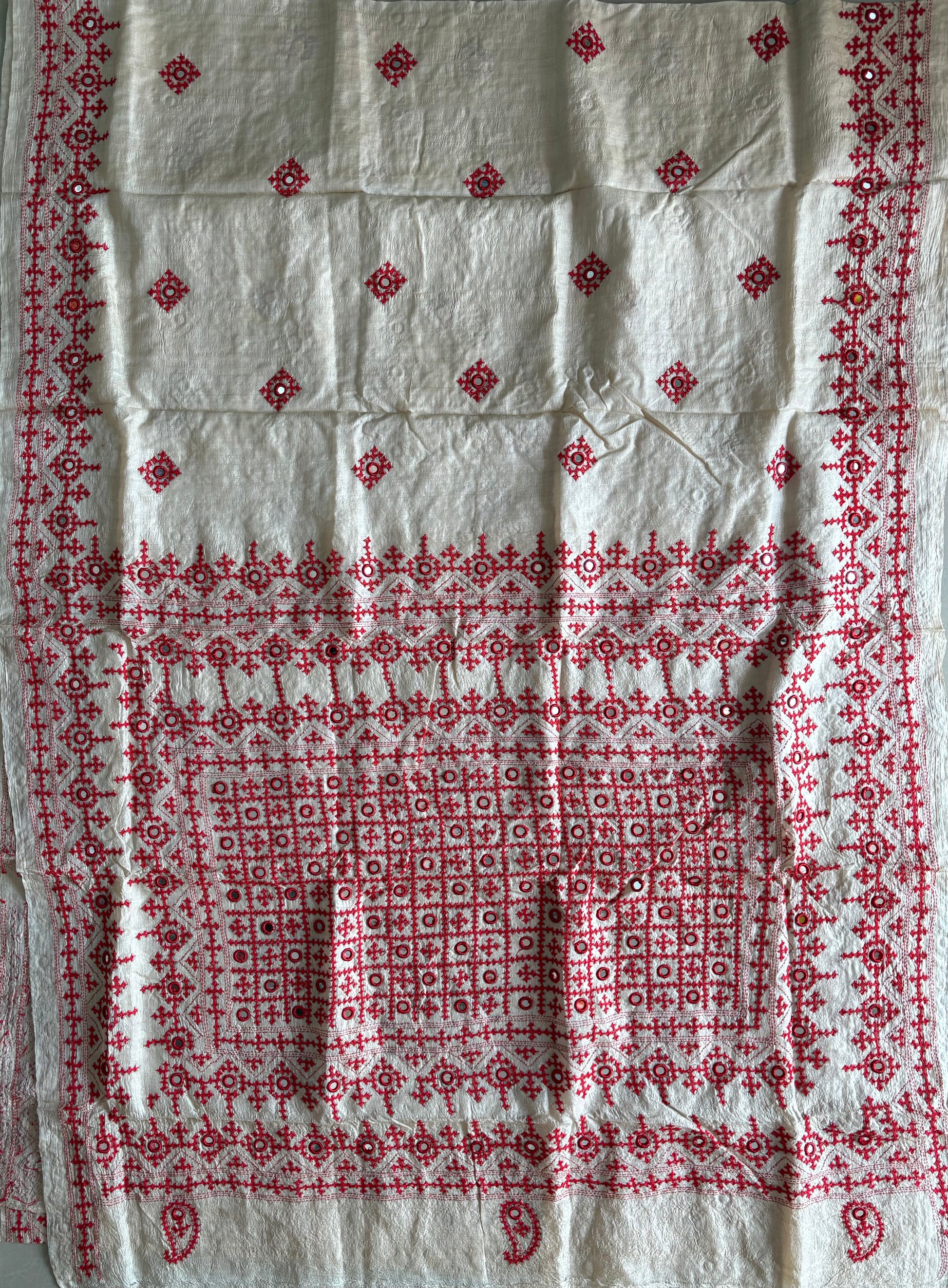 “Kutch Hand Embroidered Pure tassar Silk Saree.”