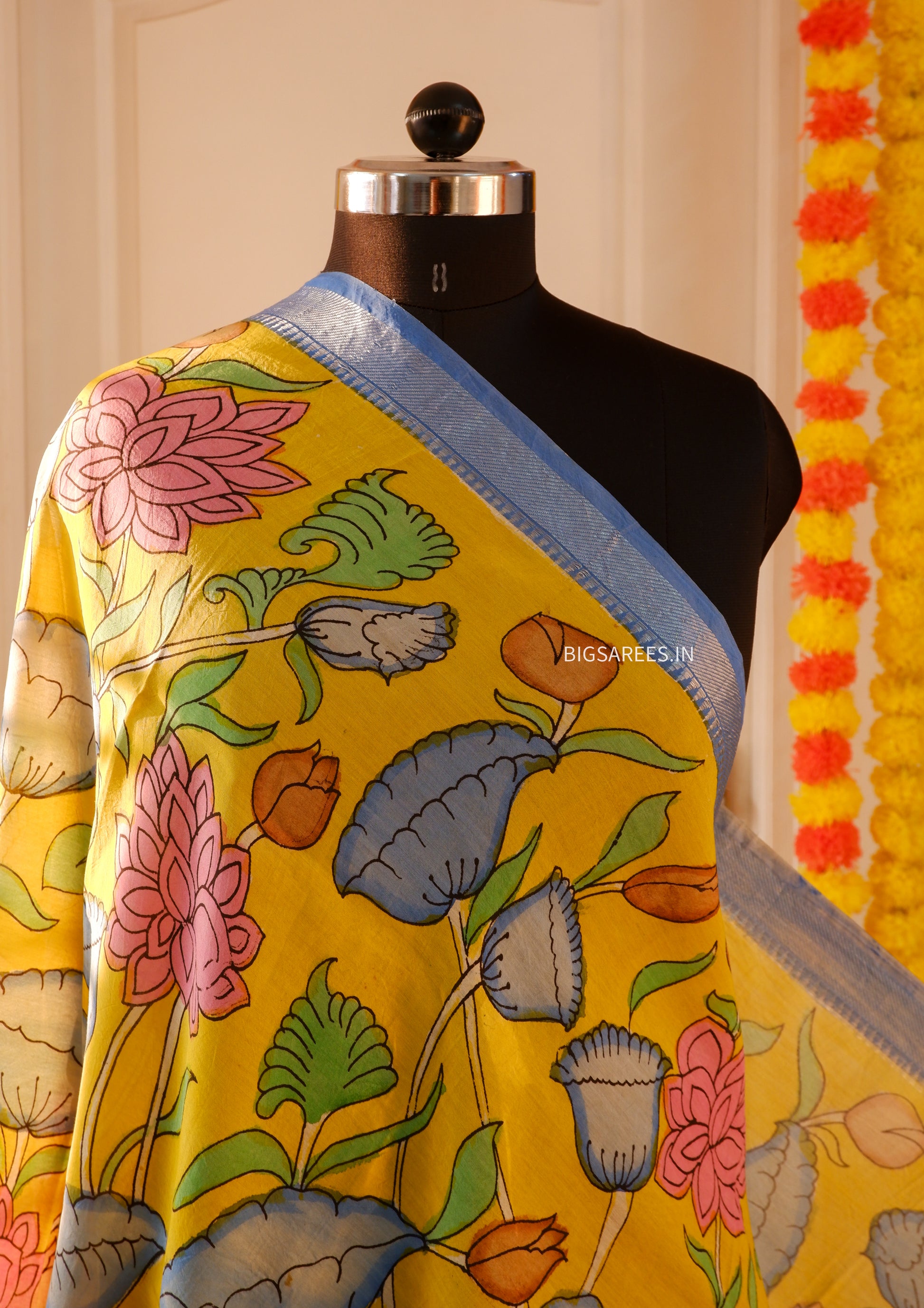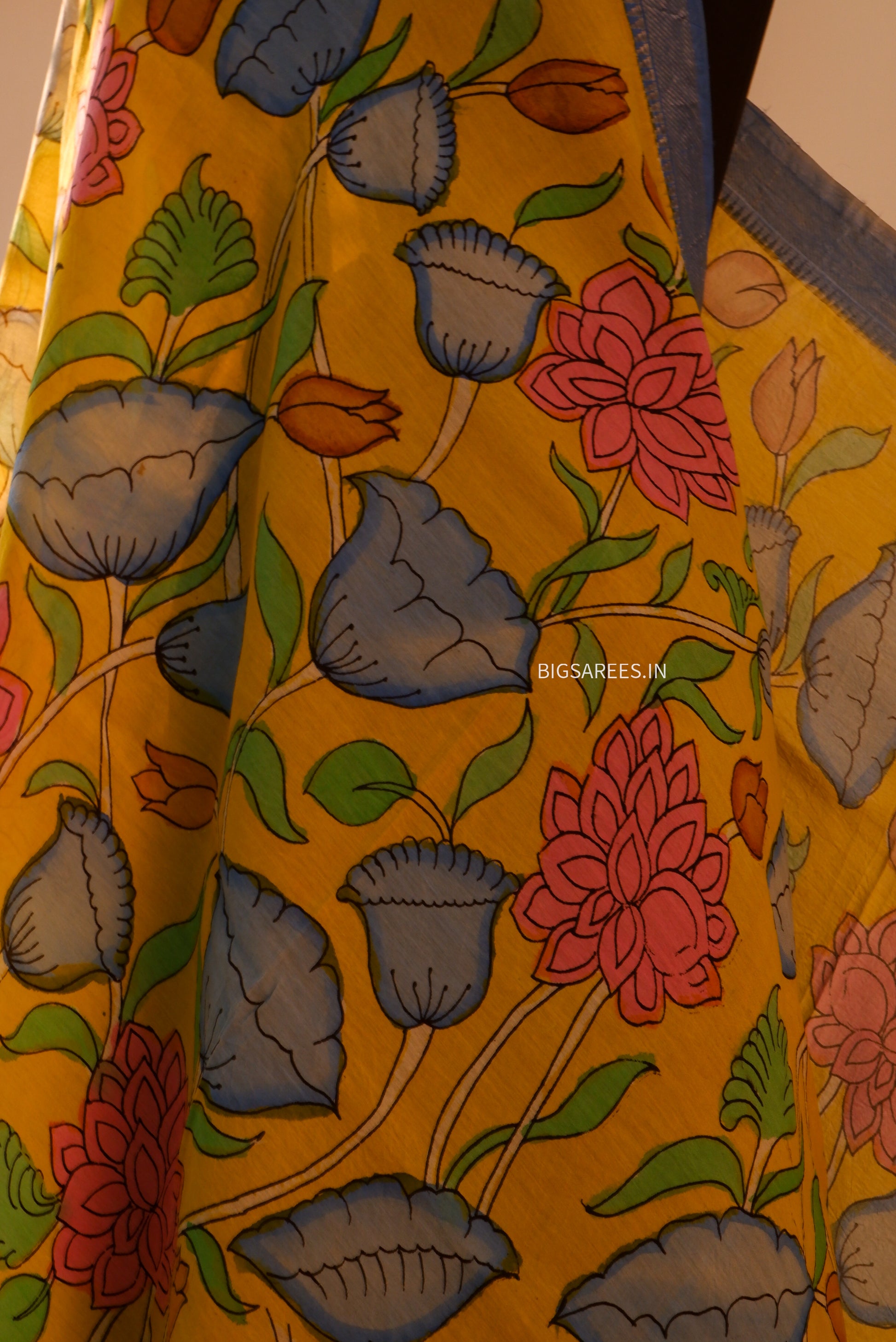 Pen Kalamkari Hand Painted Bangalore Silk Dupatta/Yellow/36"