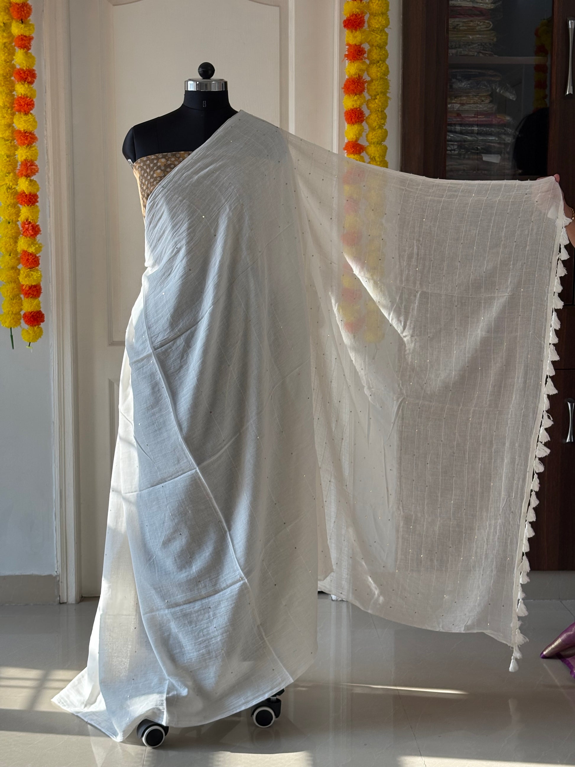 “Beautiful, Very Light Weight Very Very Soft Plain Mul Cotton Saree. Accessorized With Tessels.”