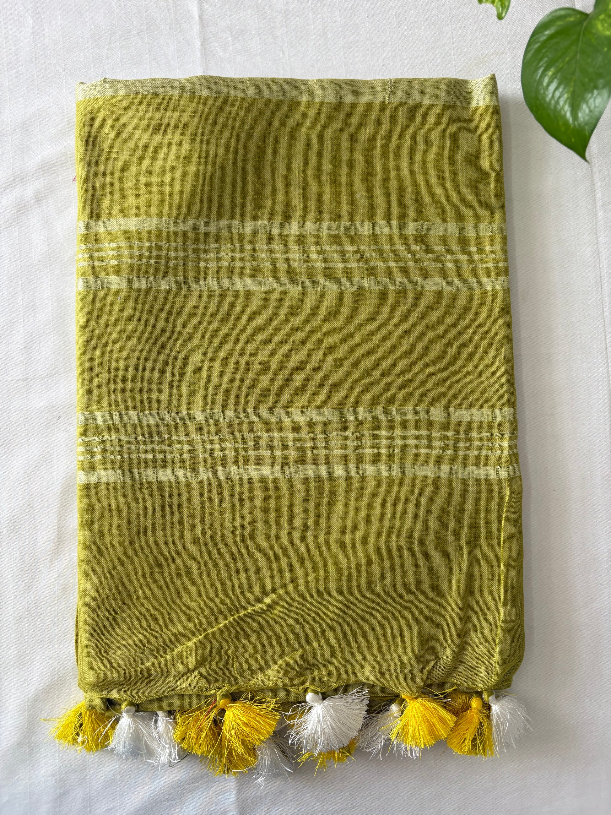 “Beautiful & Soft Cotton Linen Saree With running Blouse. Pallu Accessorised With Beautiful Tassels.