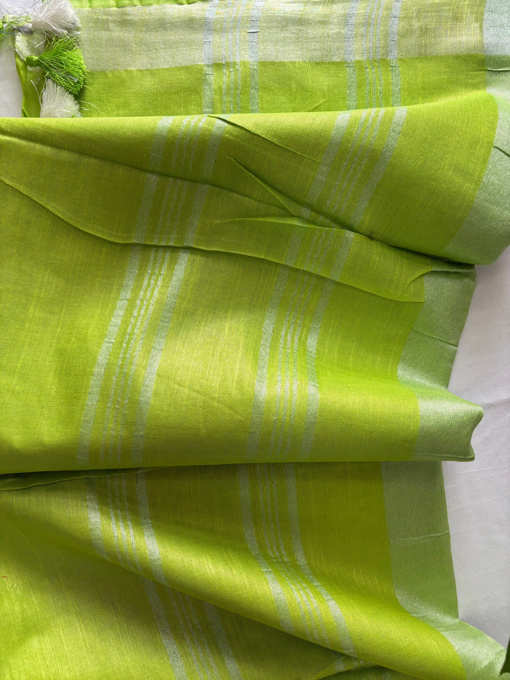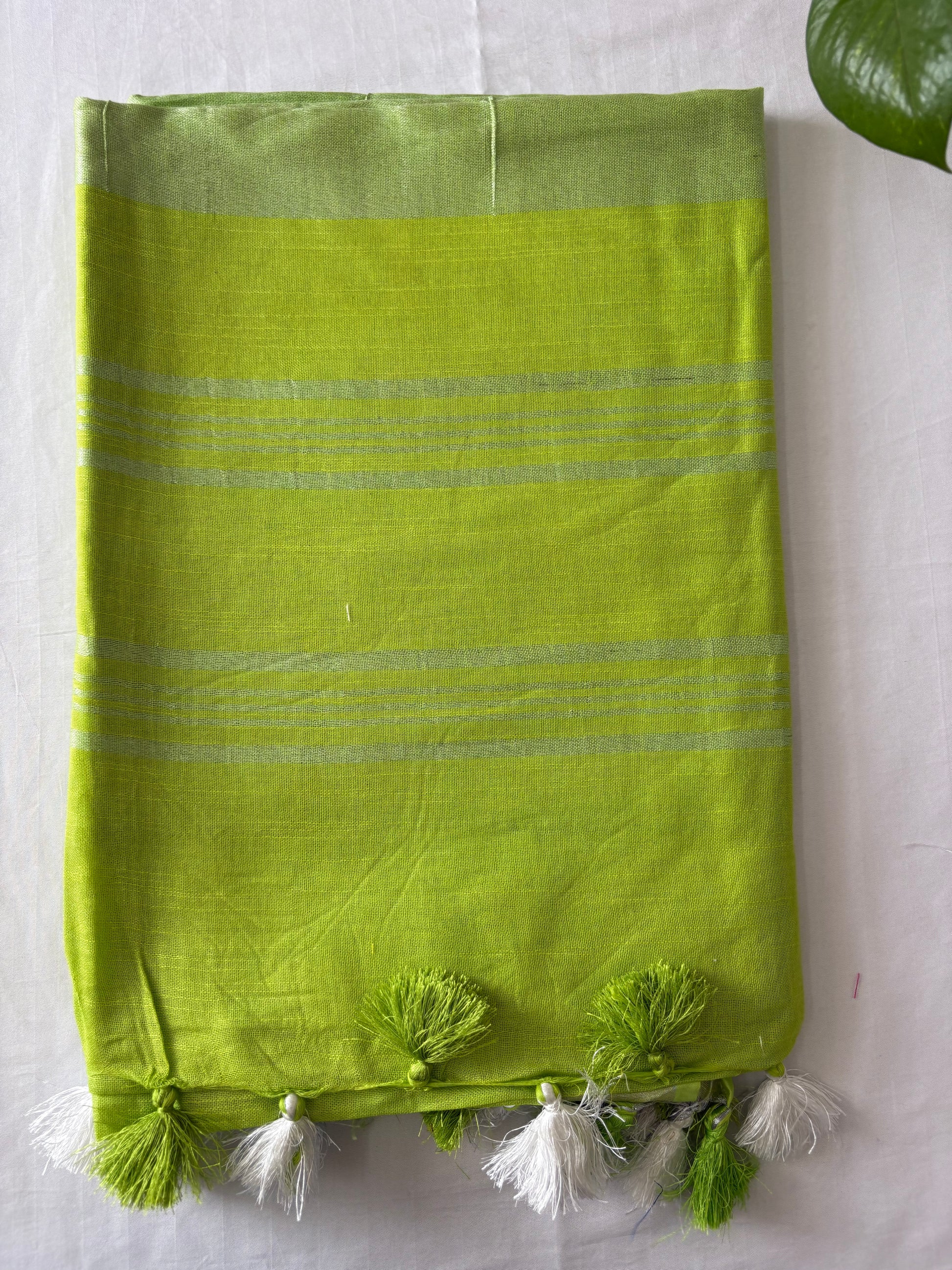 “Beautiful & Soft Cotton Linen Saree With running Blouse. Pallu Accessorised With Beautiful Tassels.