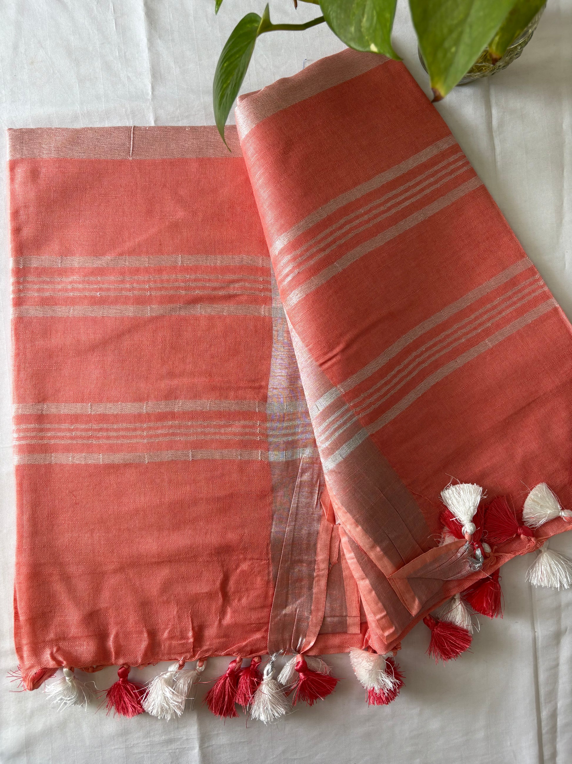 “Beautiful & Soft Cotton Linen Saree With running Blouse. Pallu Accessorised With Beautiful Tassels.