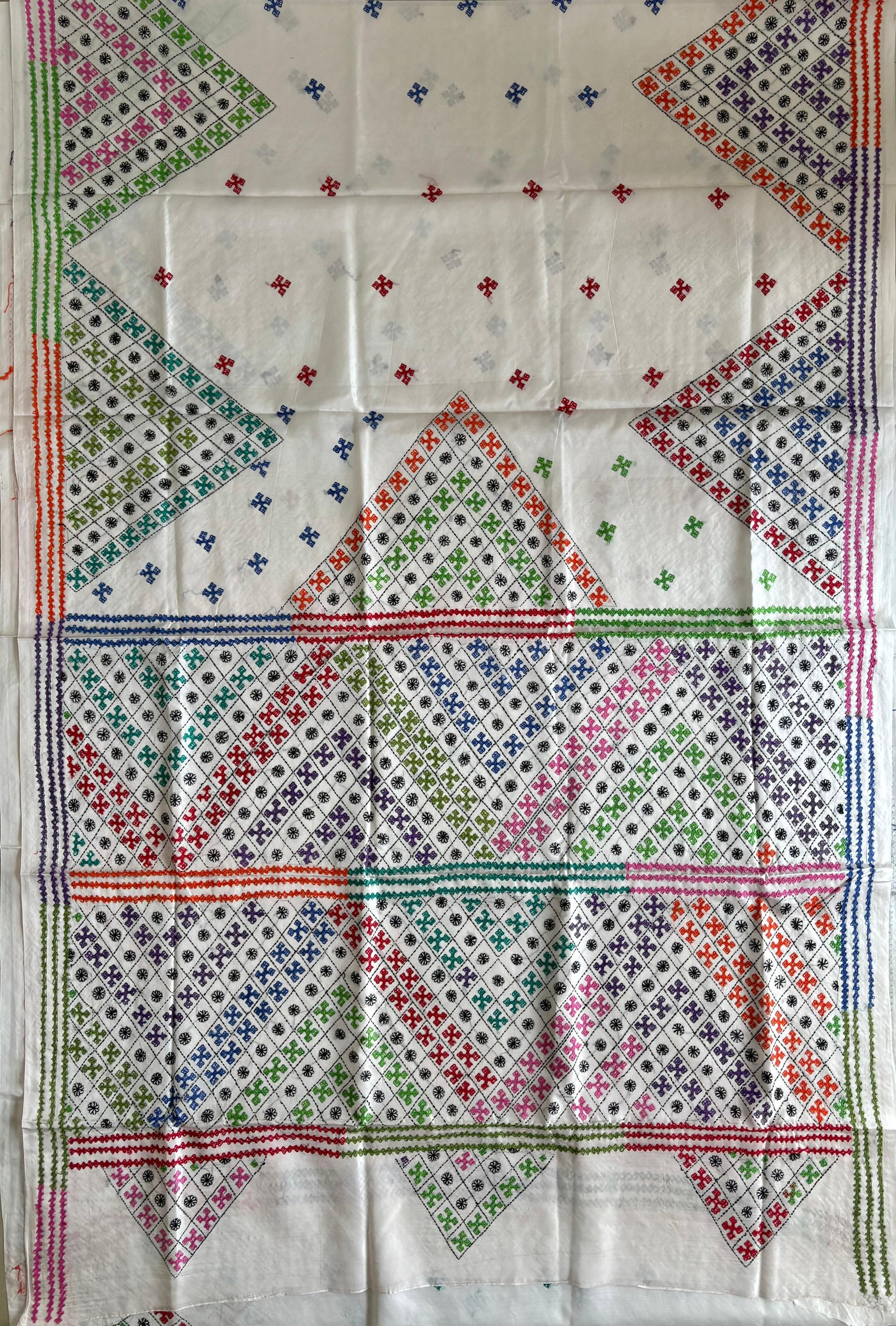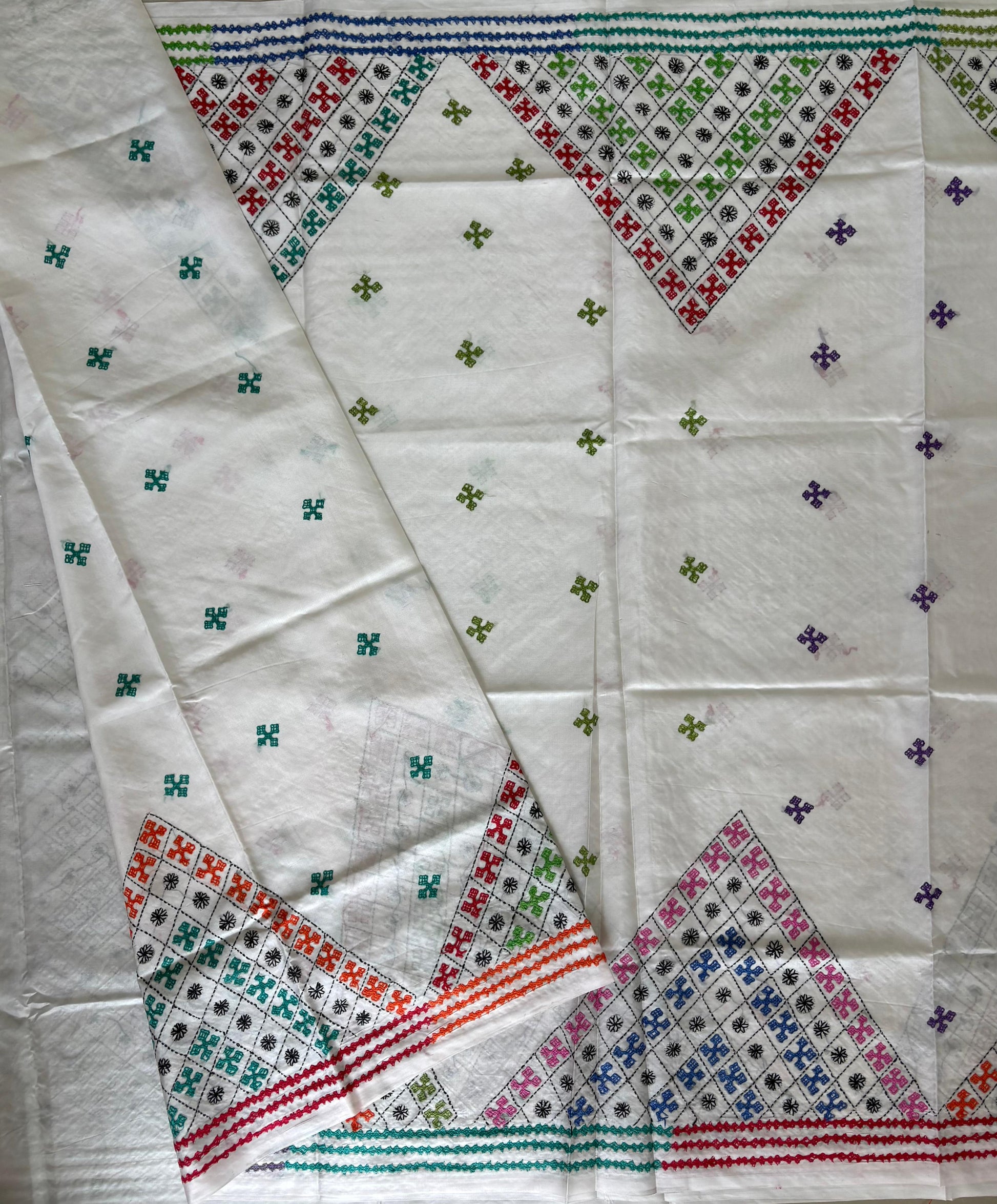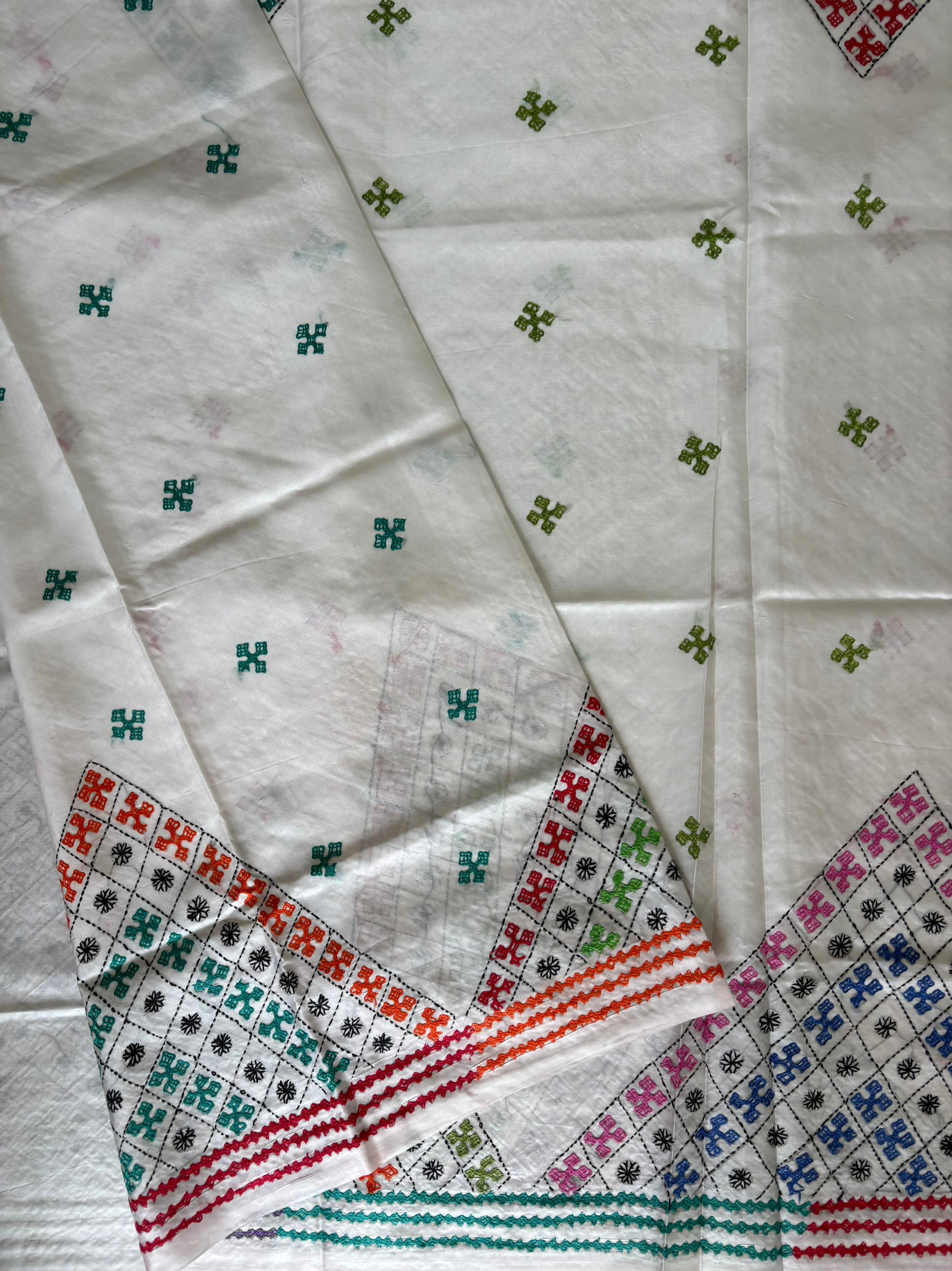 Gujrati Stitch/Kutch Hand Embroidered Art Silk Saree - Off White