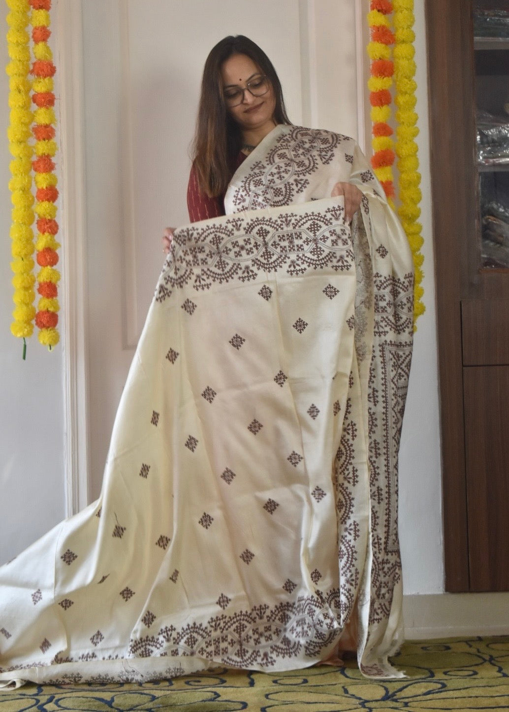 Kutch Hand Embroidered Saree| Pure Bangalore Silk | Off-White
