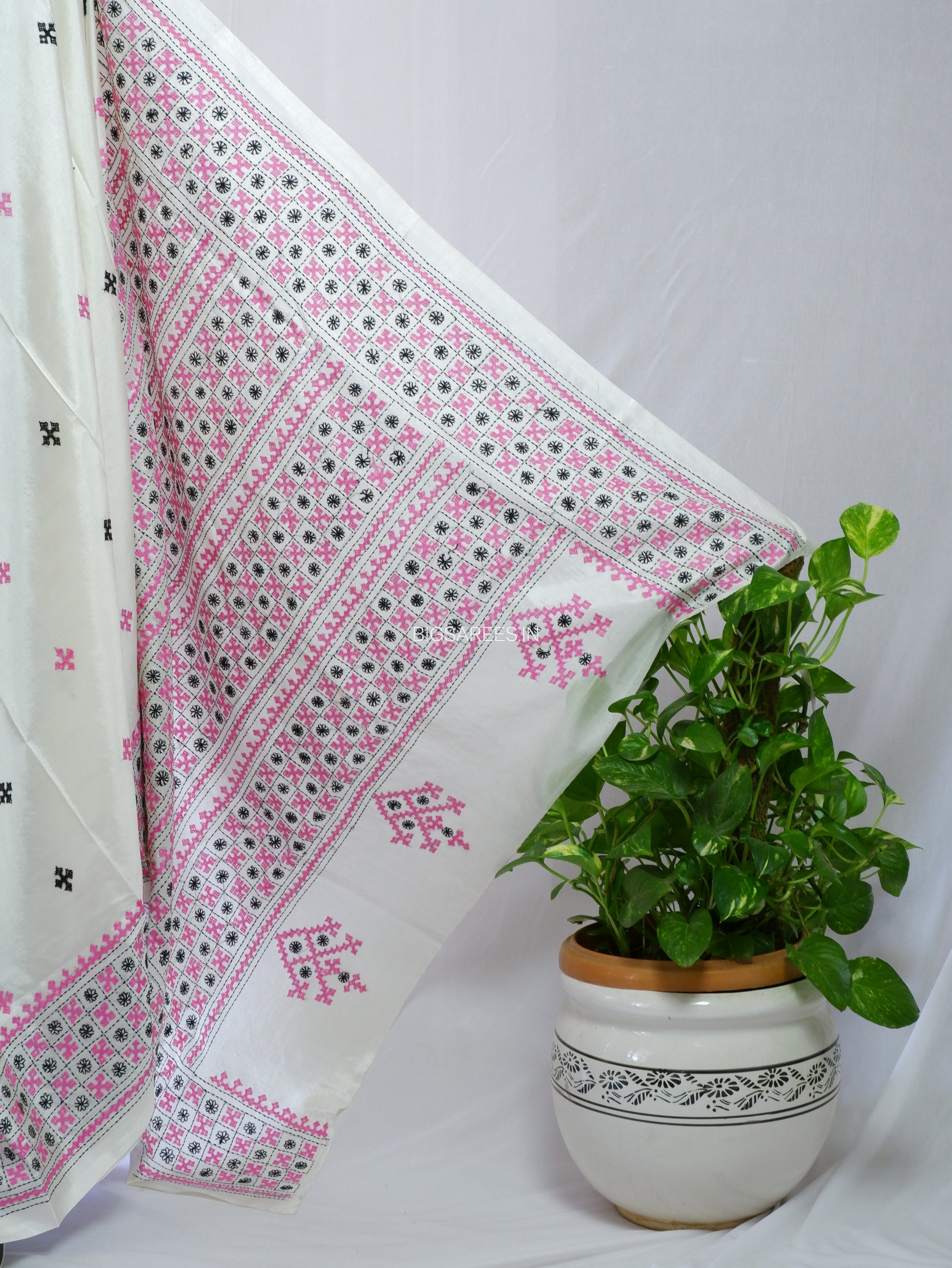 - You may notice occasional black spots, stretch marks or natural marks of the hand-embroidered process that are not considered defects. These small imperfections are a testament to the saree’s authenticity and handmade charm. Please cherish these details, lovingly created by our artisans.