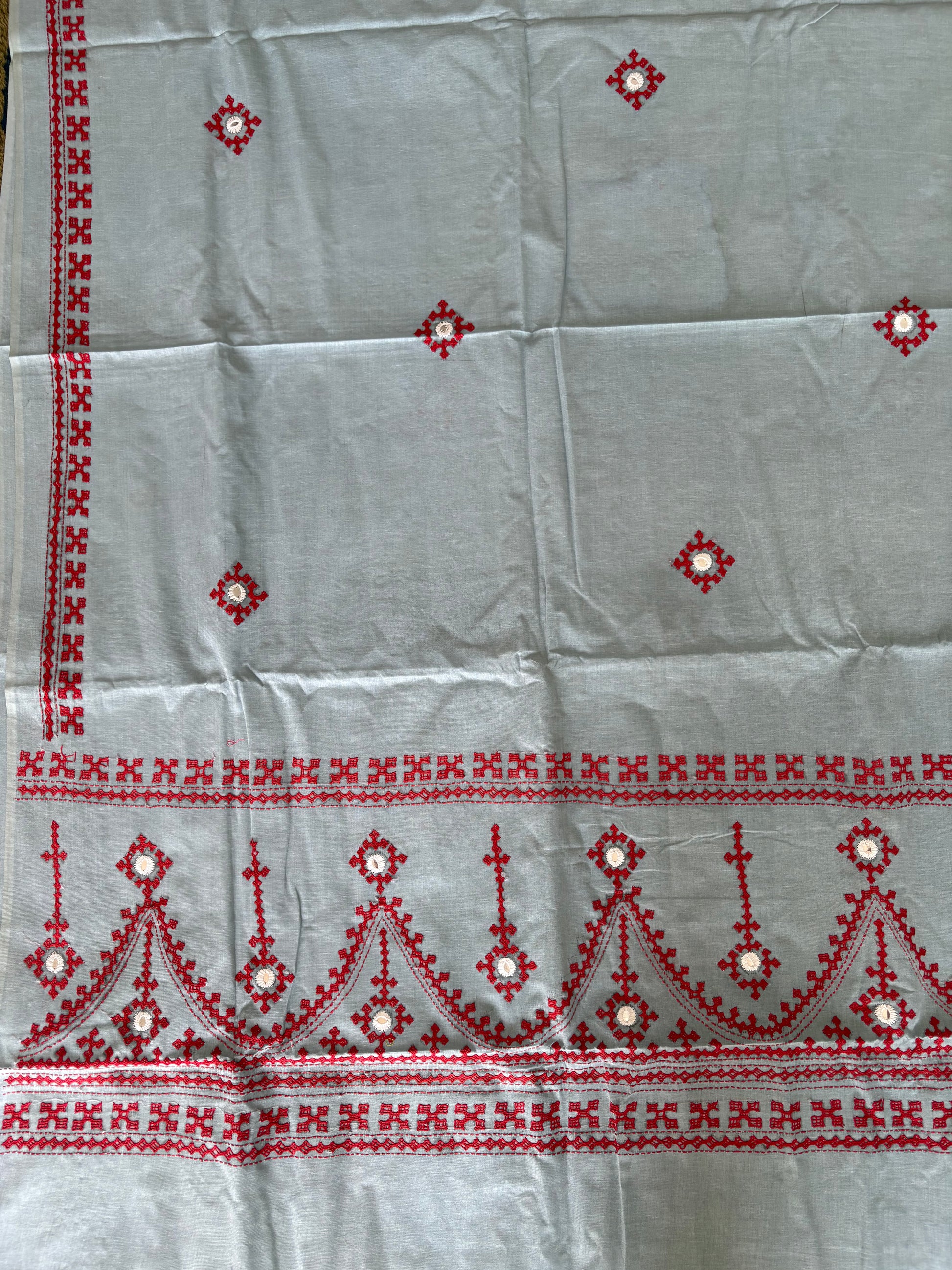 Gujrati Stitch/Kutchi Hand Embroidered malmal Cotton Saree - Grey