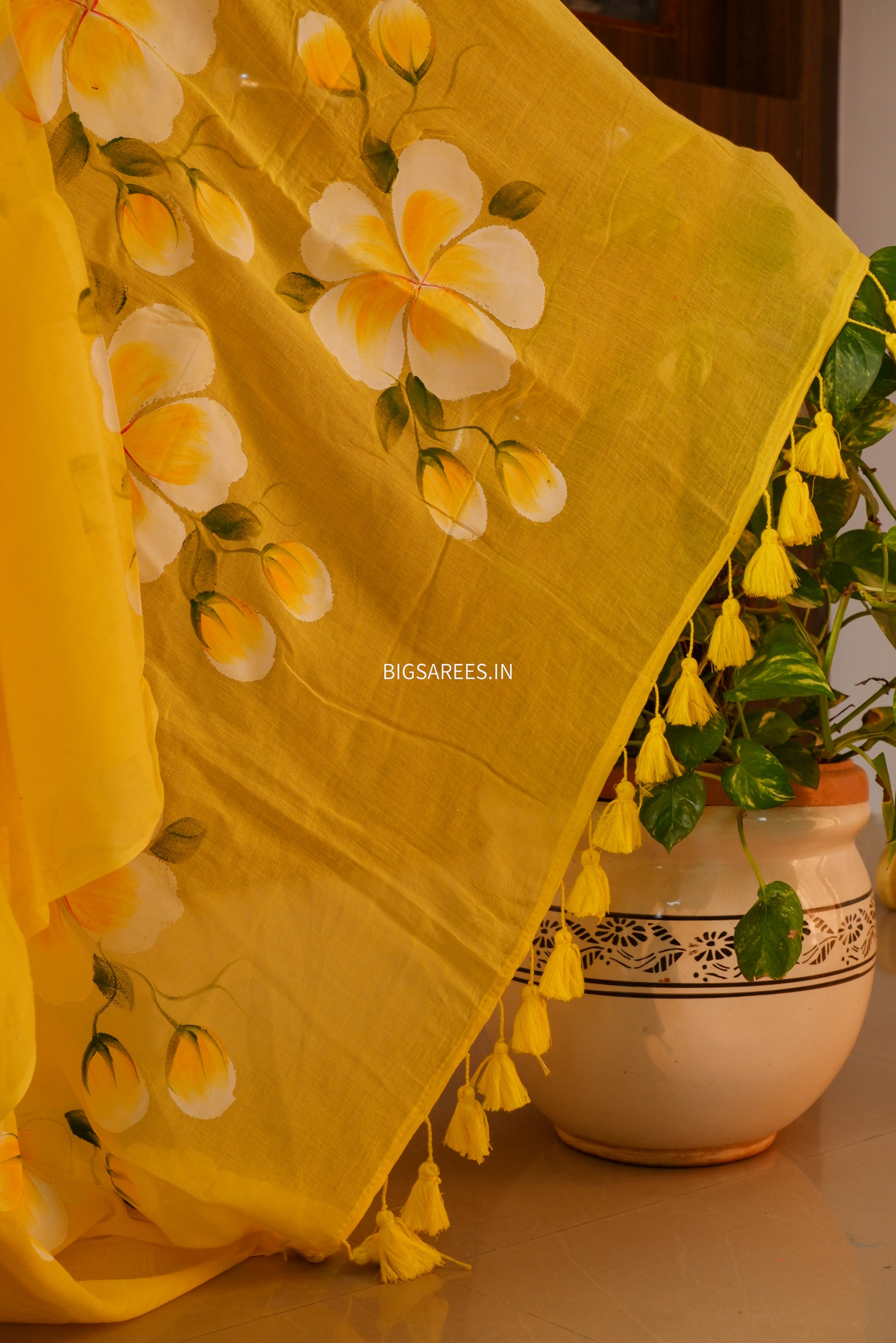 The hand-painted floral motifs add a playful yet artistic touch, celebrating slow, thoughtful making and the beauty of handwork. Finished with delicate tassel detailing, the saree carries a light, easy elegance that feels effortless to style.