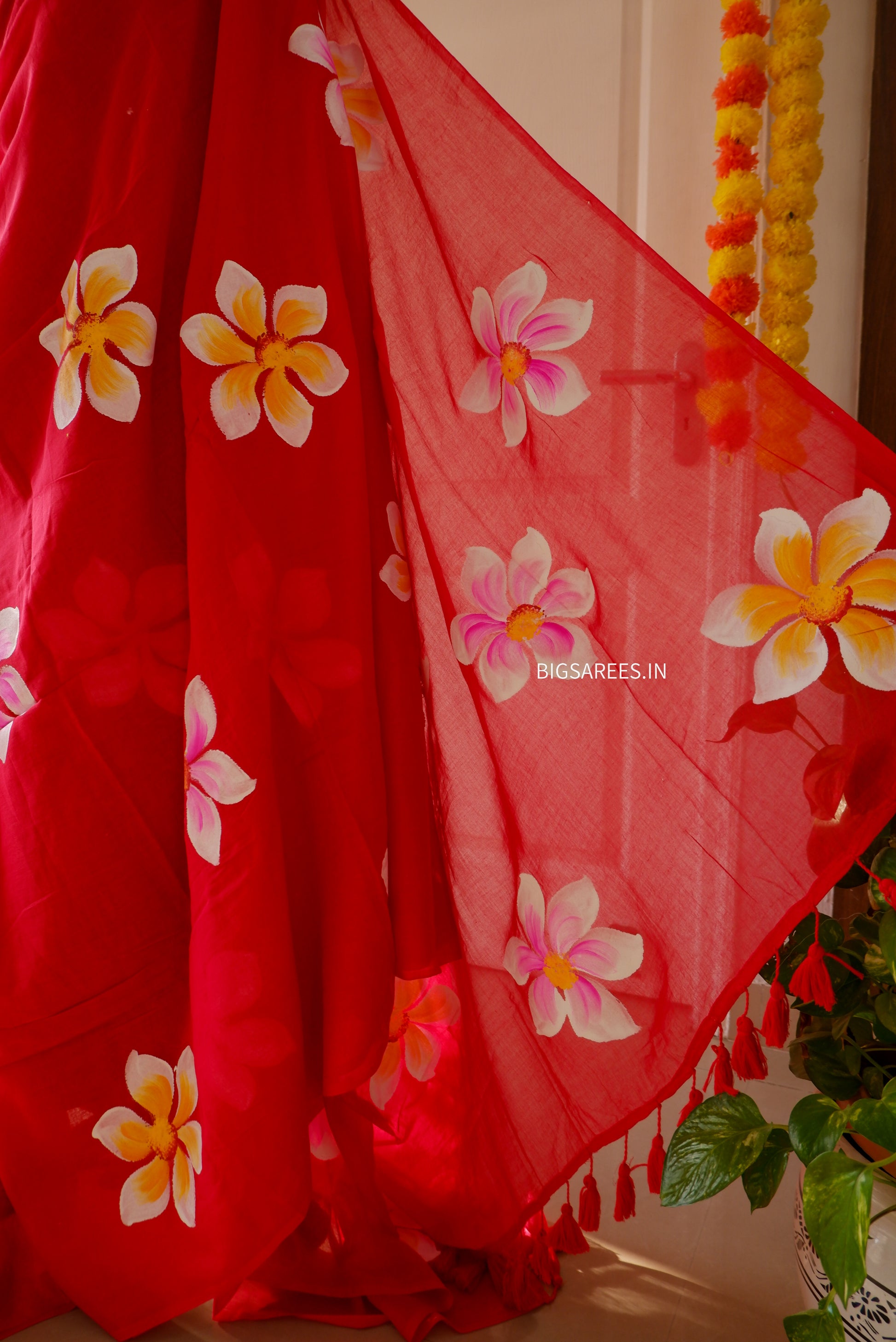The hand-painted floral motifs add a playful yet artistic touch, celebrating slow, thoughtful making and the beauty of handwork. Finished with delicate tassel detailing, the saree carries a light, easy elegance that feels effortless to style.
