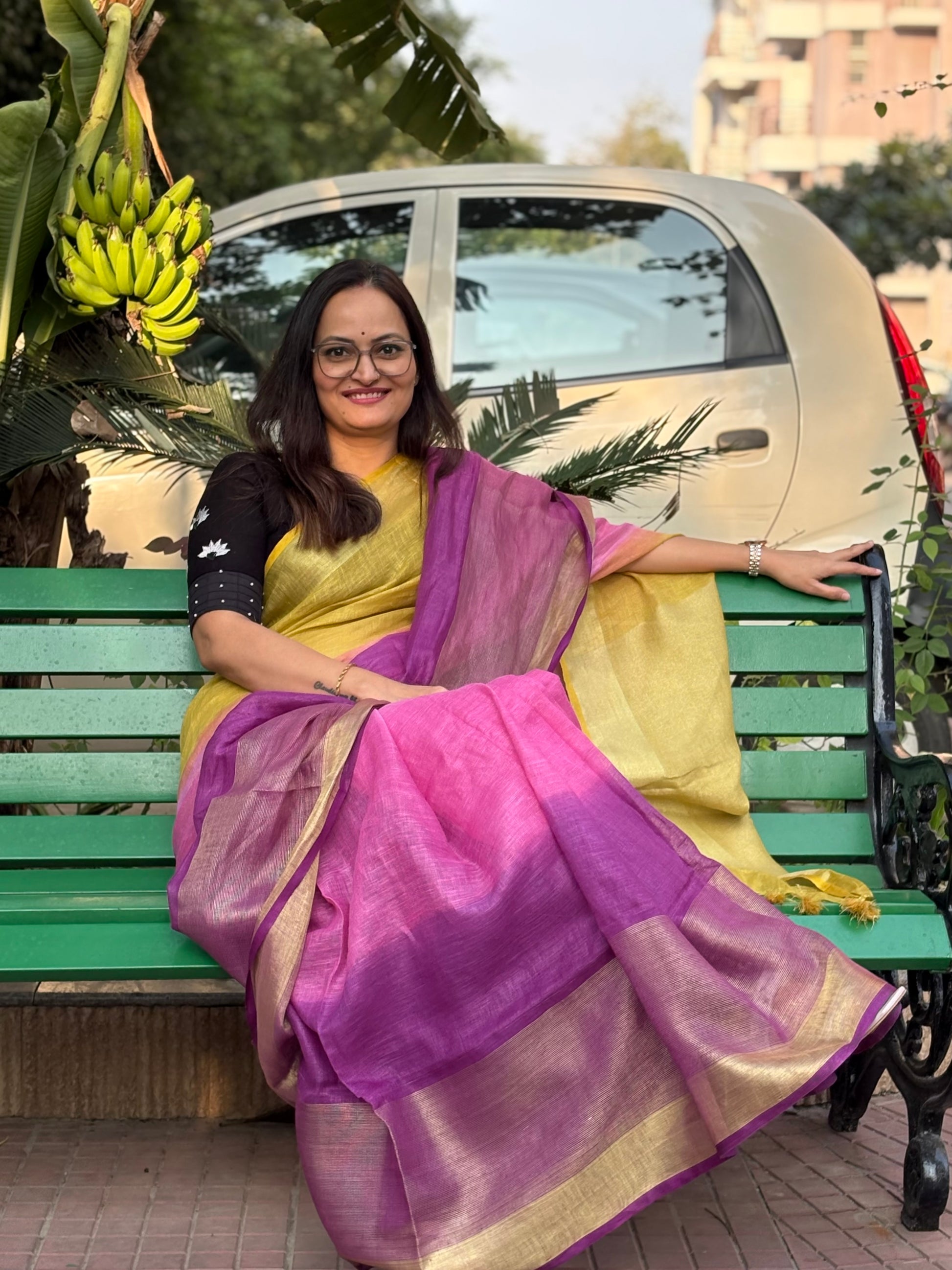 “Beautiful Linen By Linen Saree. Pallu Accessorized With Beautiful Tassels.