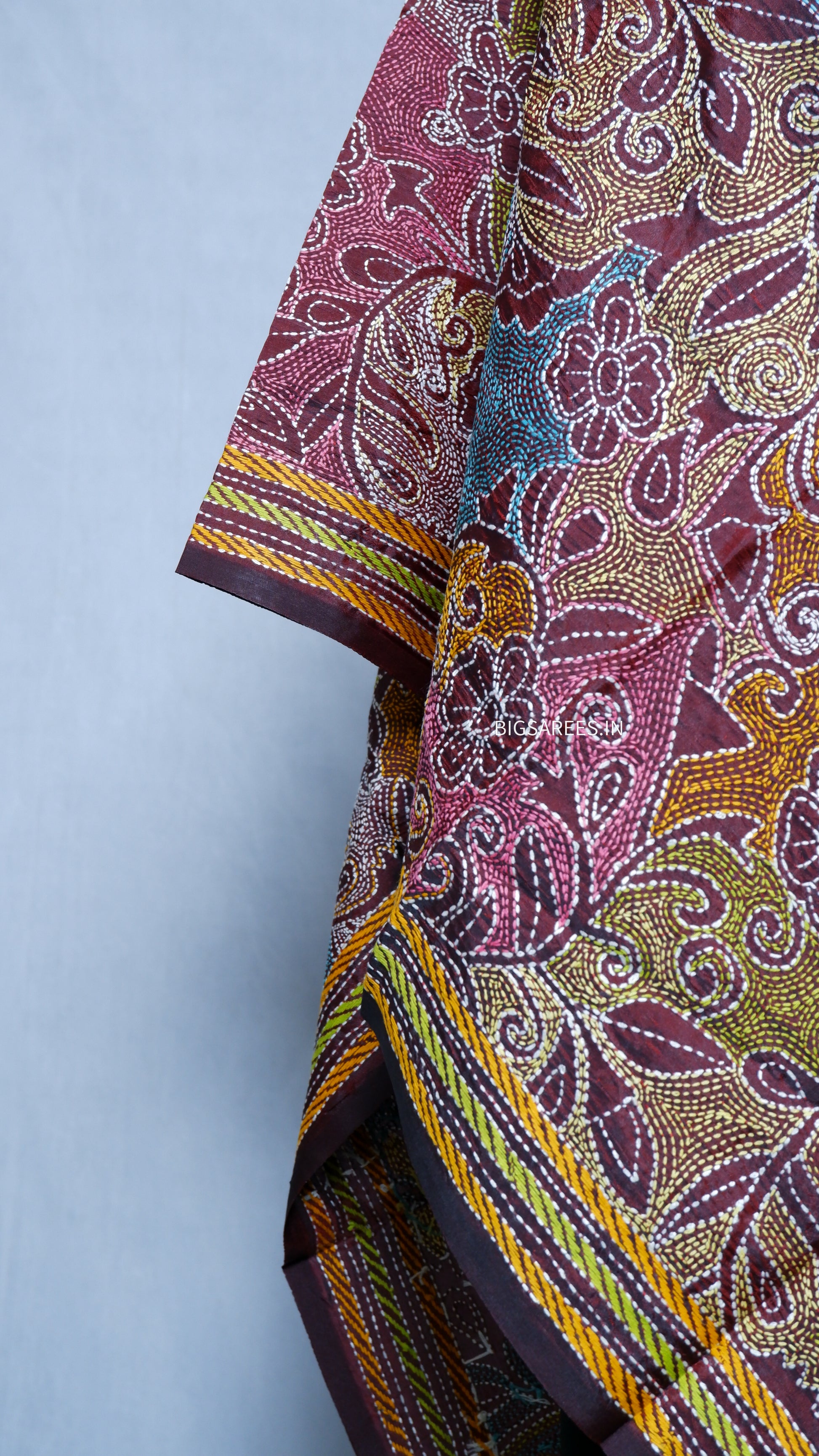 Kantha Art Silk Stole | Muted Reddish-Brown | 22" |