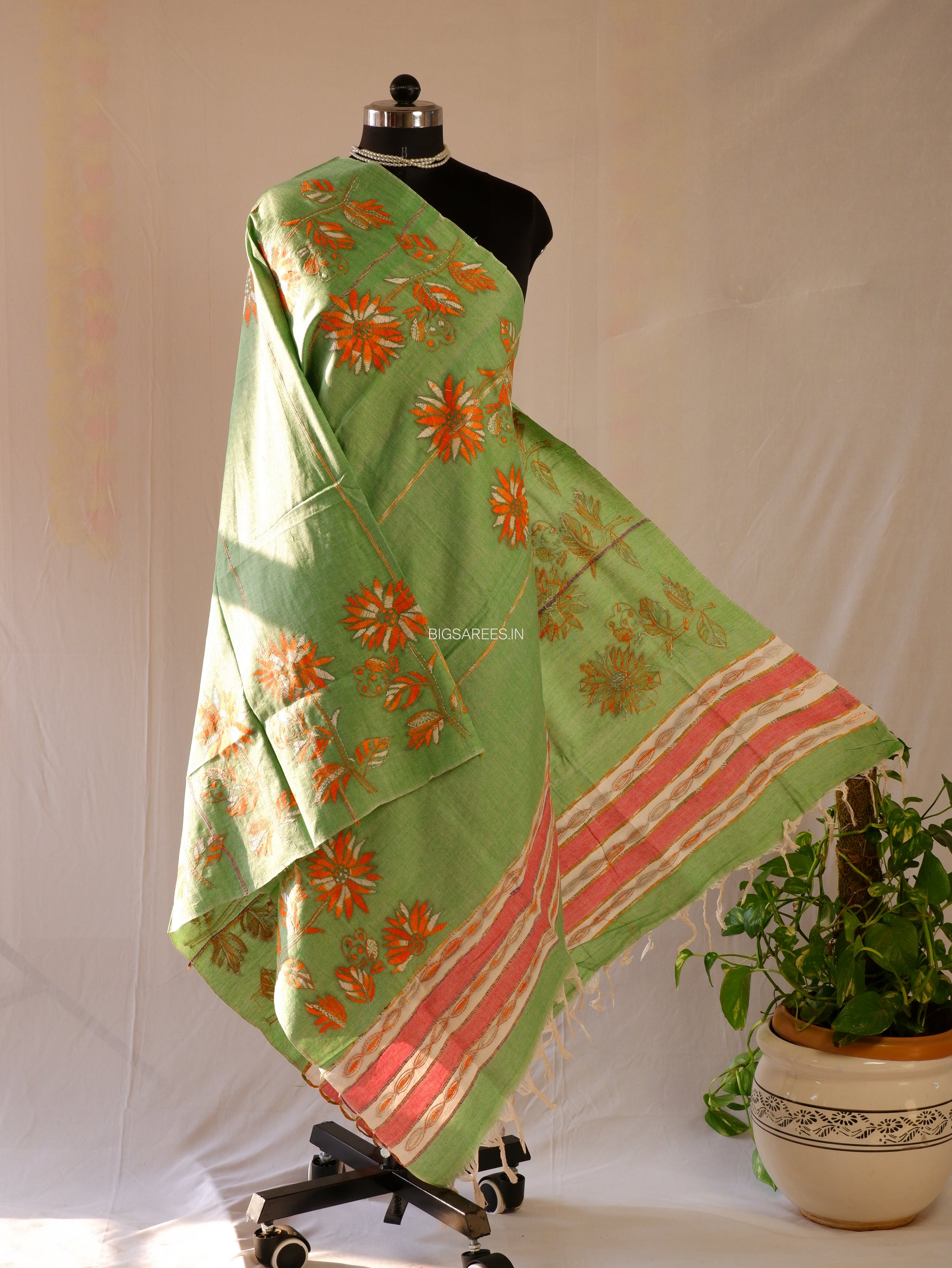 Hand Embroidered Kantha-Stitch Dupatta | Pure Khesh Cotton | Olive Green