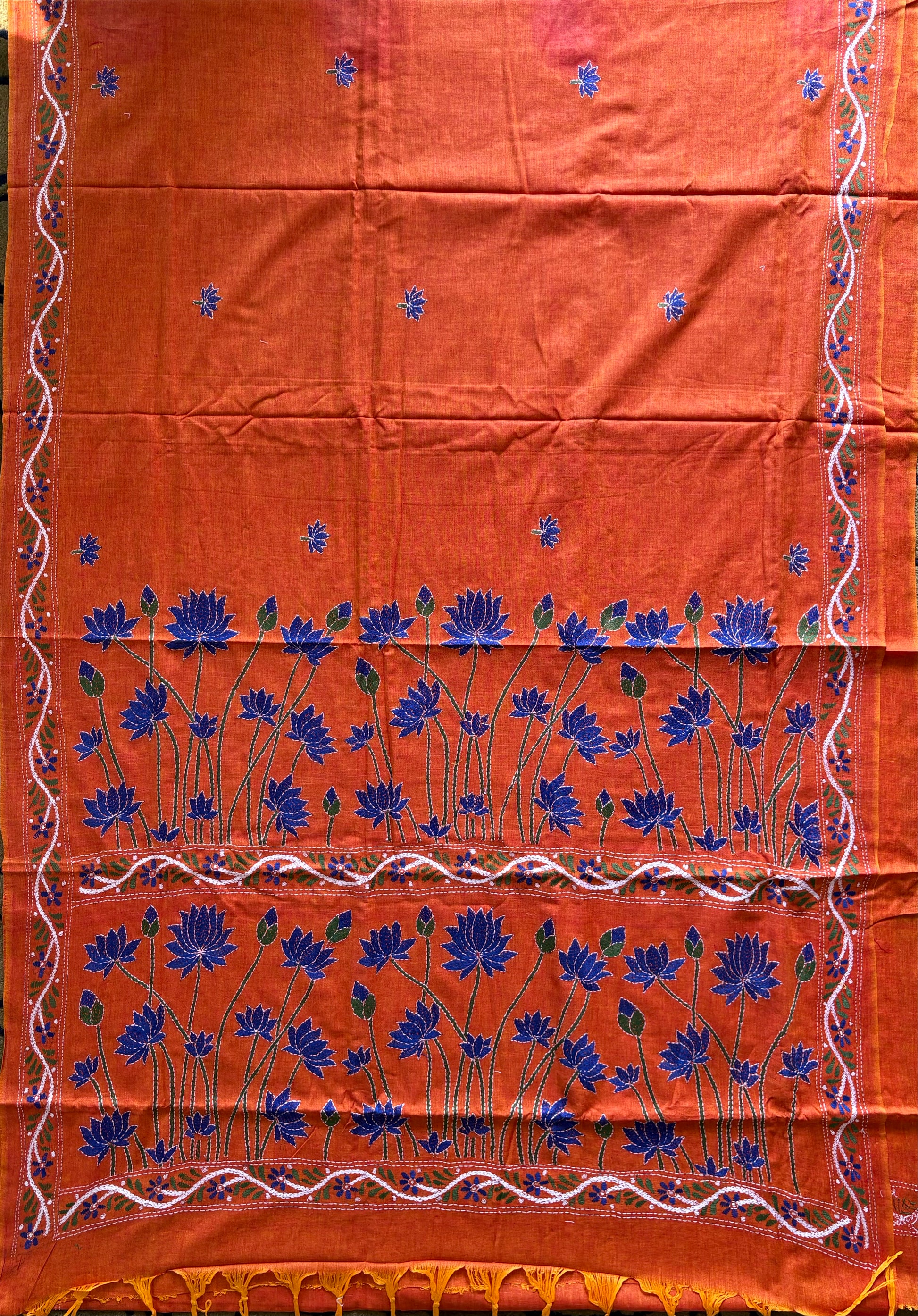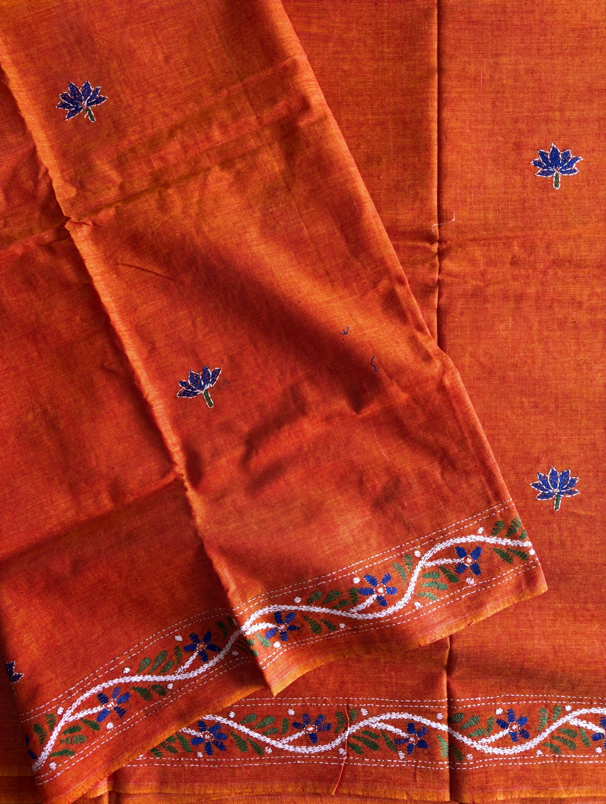 Kantha stitch Khadi Cotton Saree - Saffron