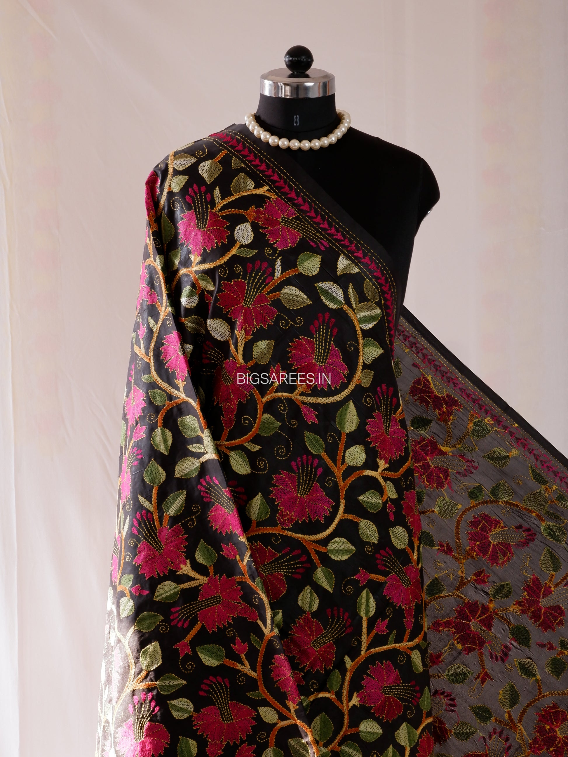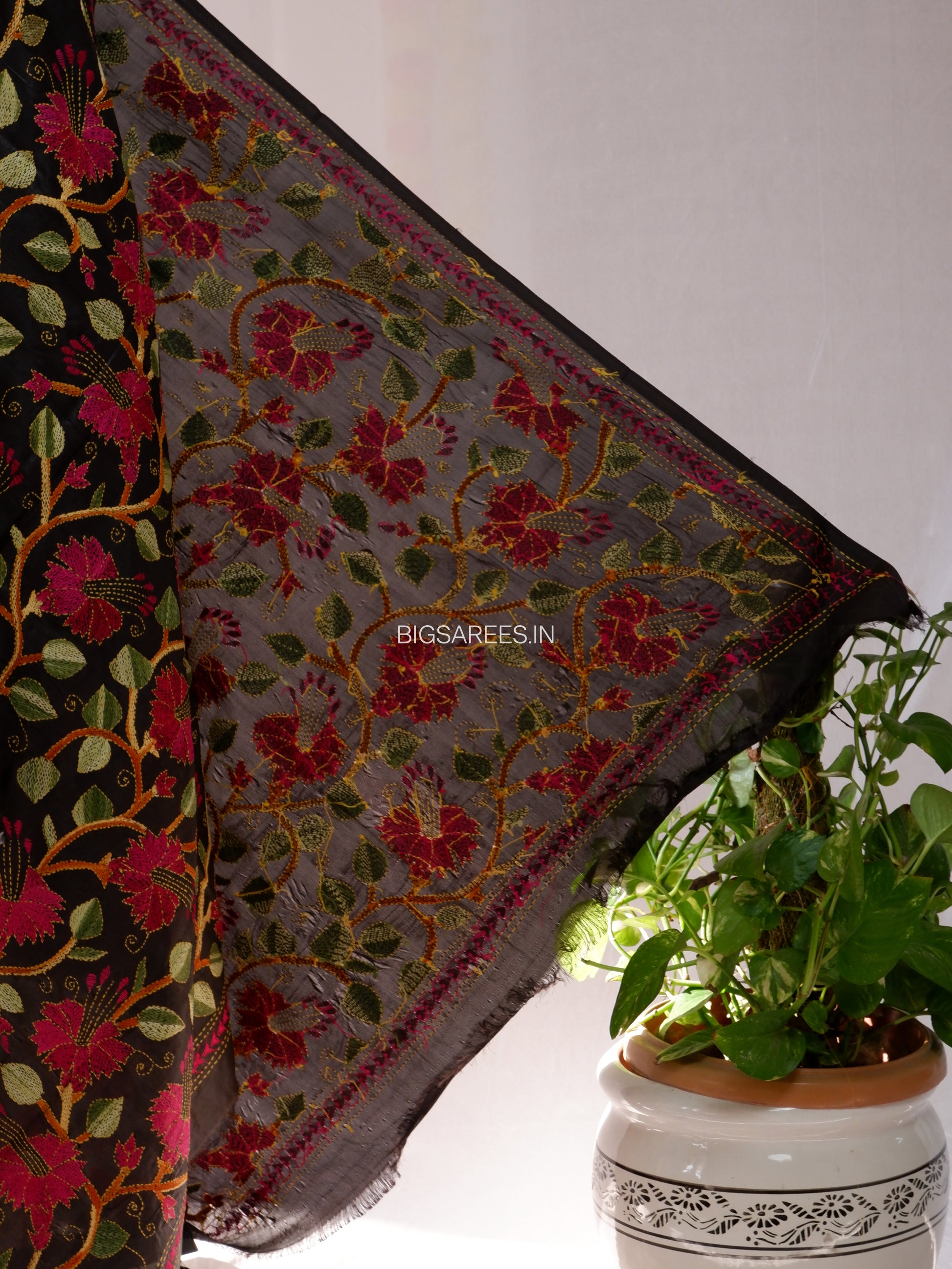 Kantha Hand-Embroidered Dupatta | Blended Bangalore Silk | Full Work | Black