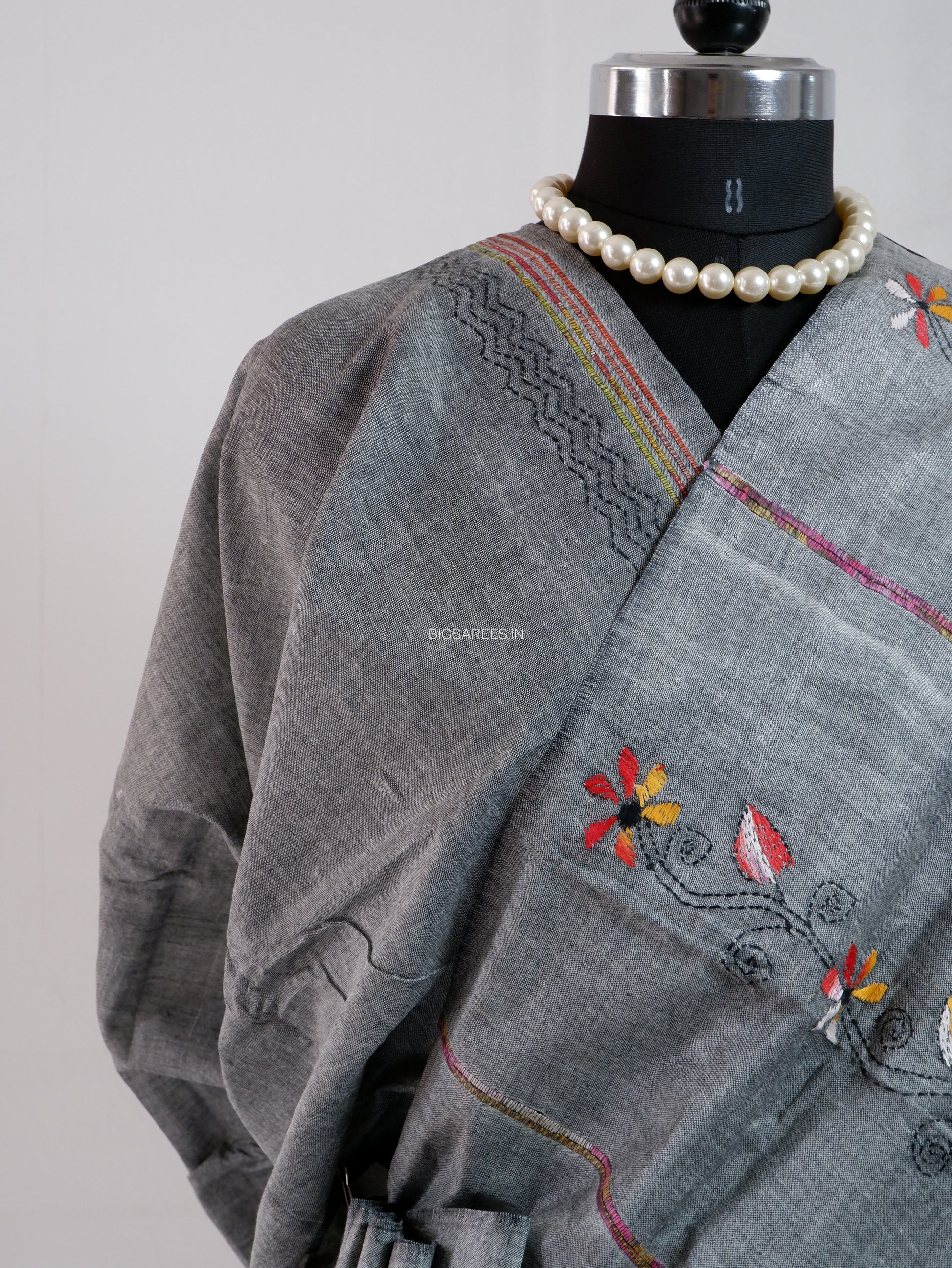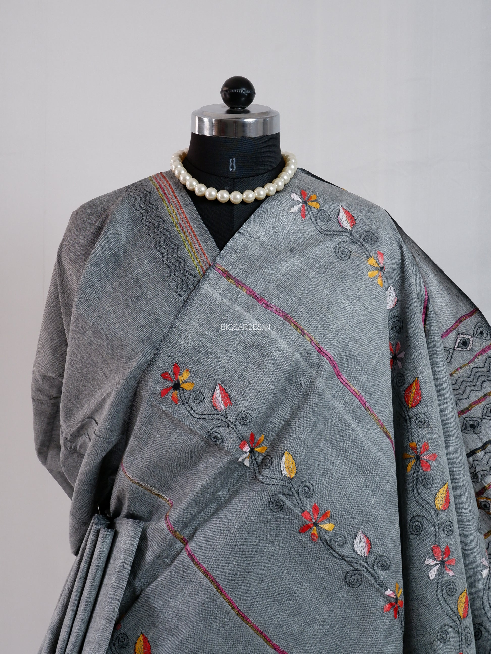Kantha Stitch Hand-Embroidered Saree | Pure Khesh Cotton | Grey