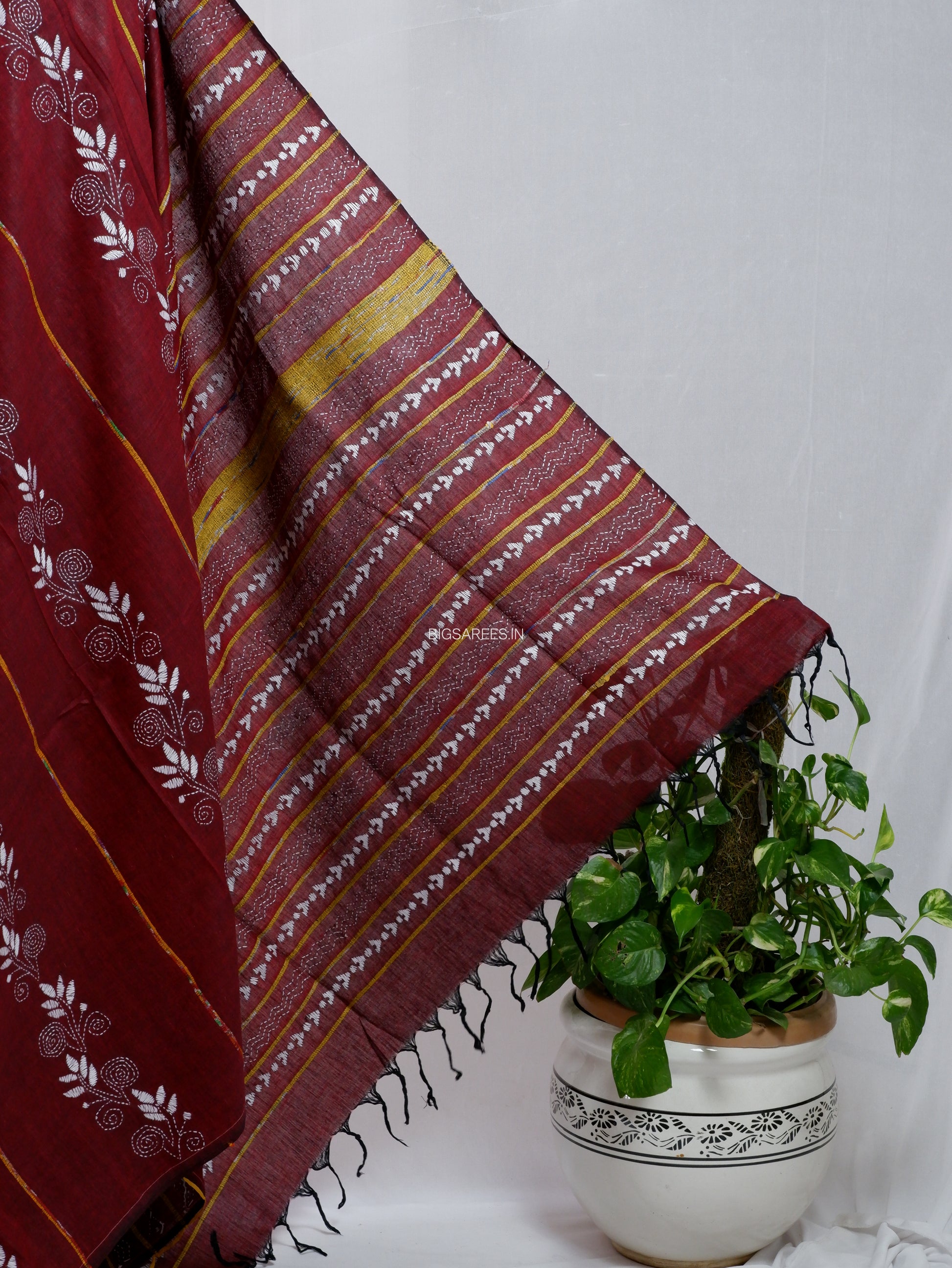 Kantha Stitch Hand-Embroidered Saree | Pure Khesh Cotton | Maroon