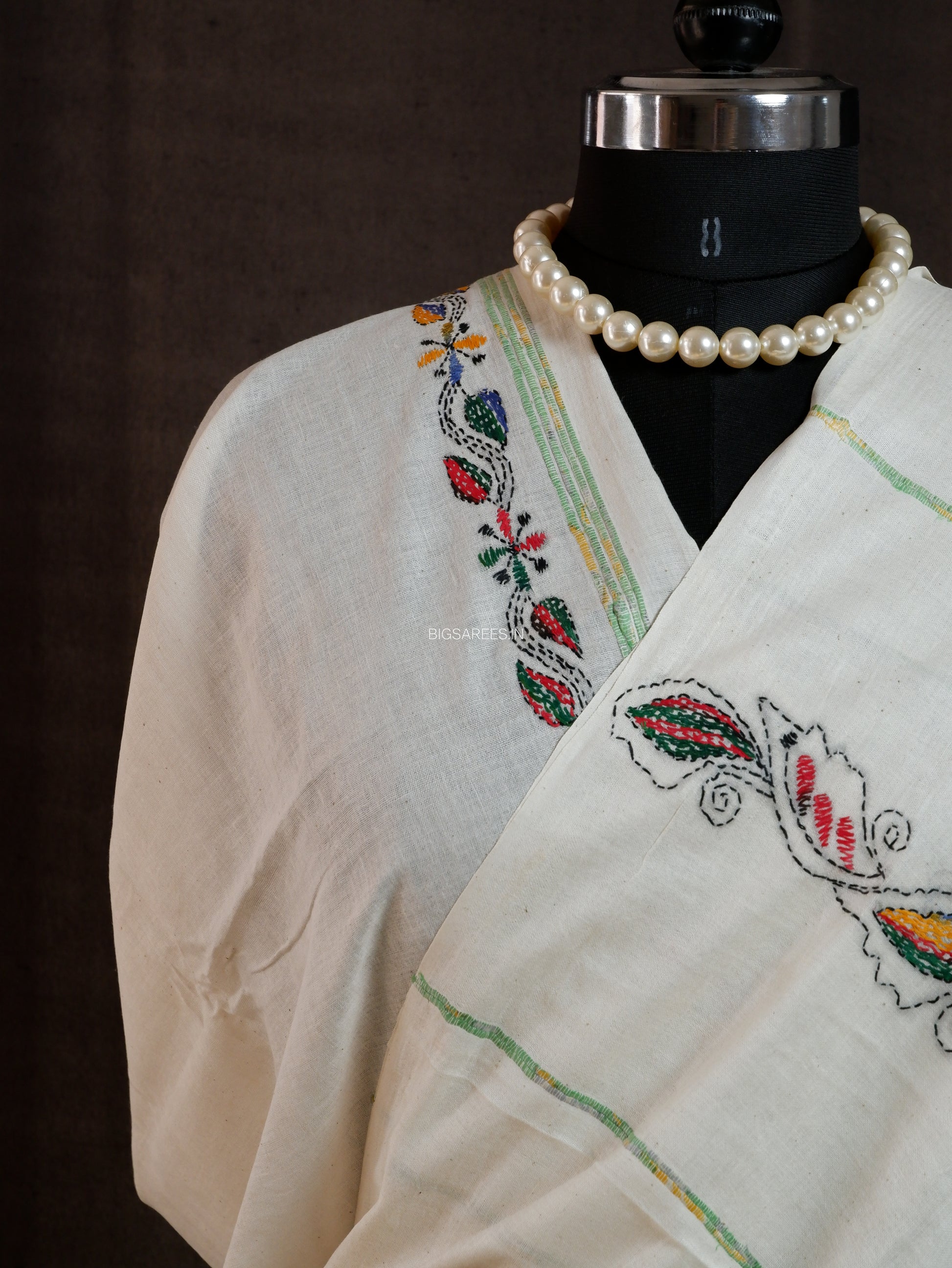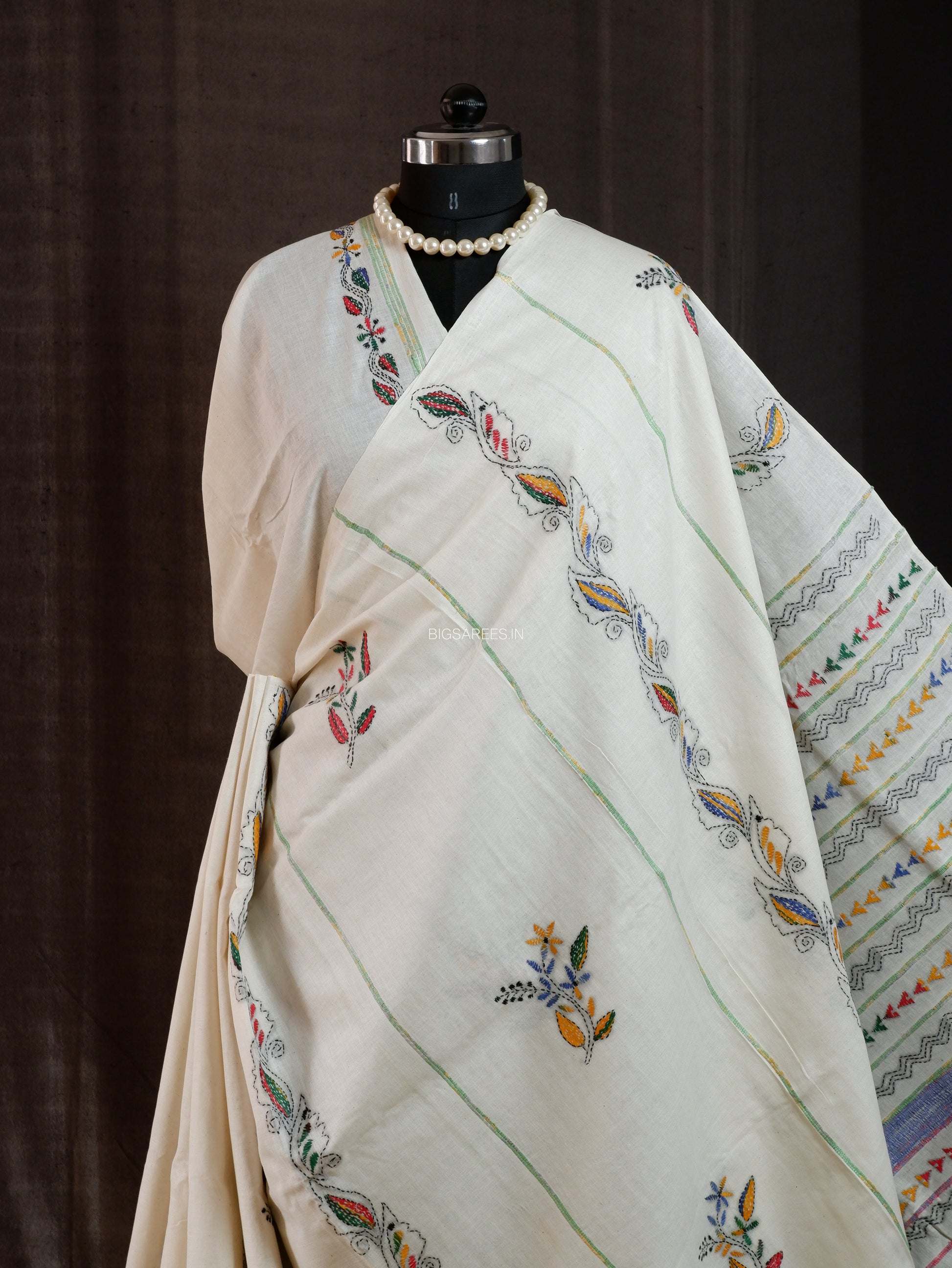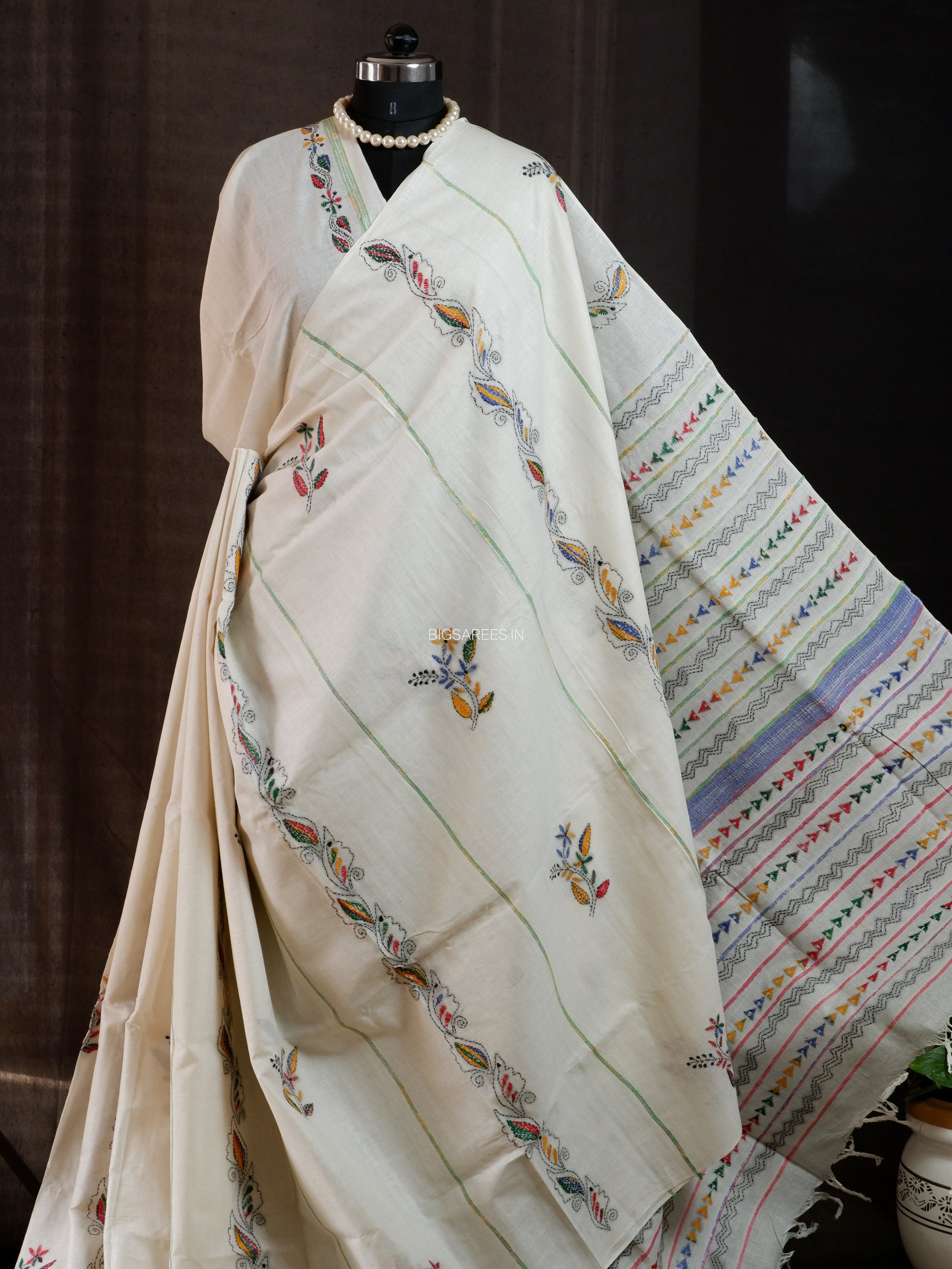 Kantha Stitch Hand-Embroidered Saree | Pure Khesh Cotton | White