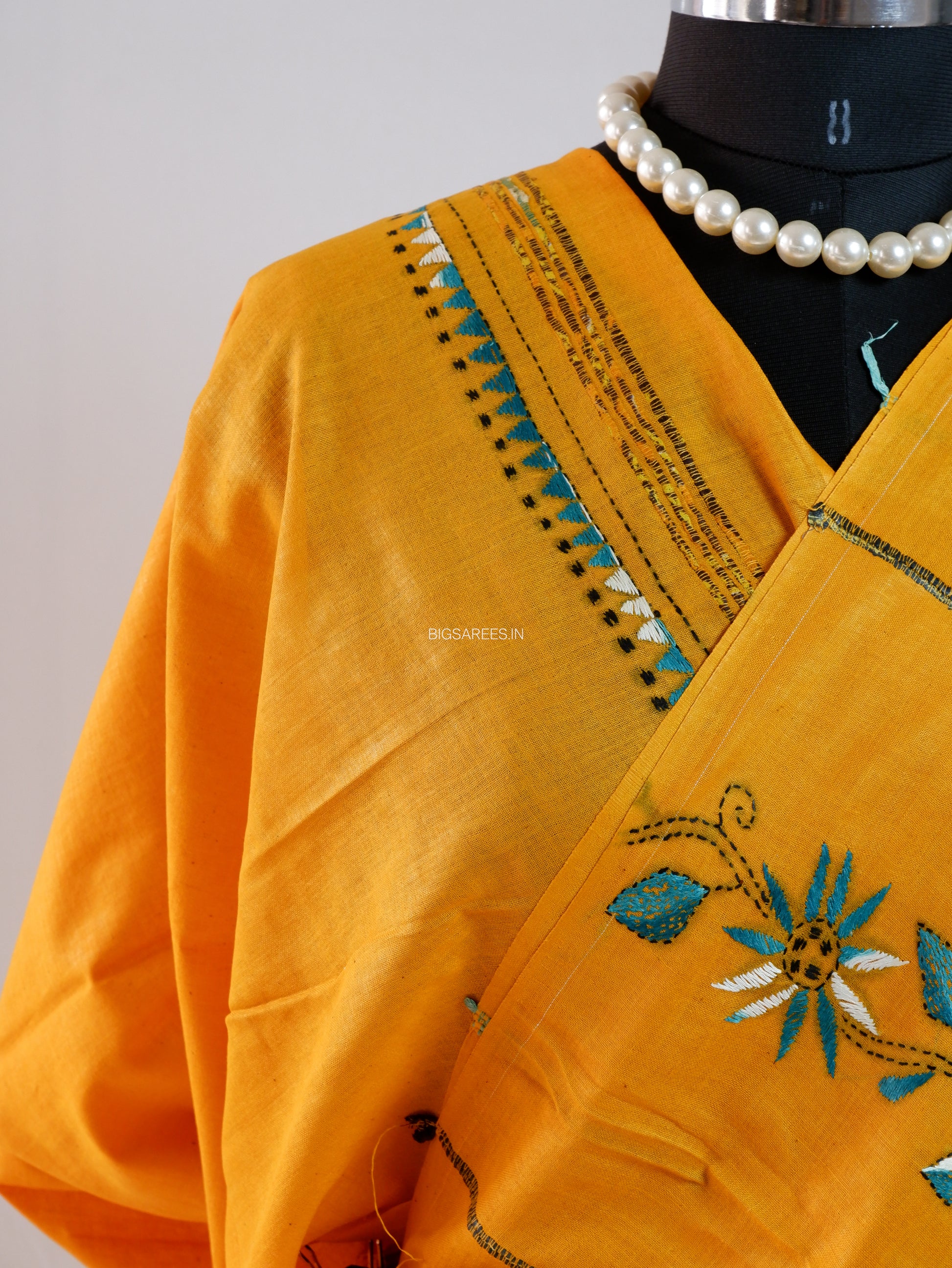 Kantha Stitch Hand-Embroidered Saree | Pure Khesh Cotton | Yellow