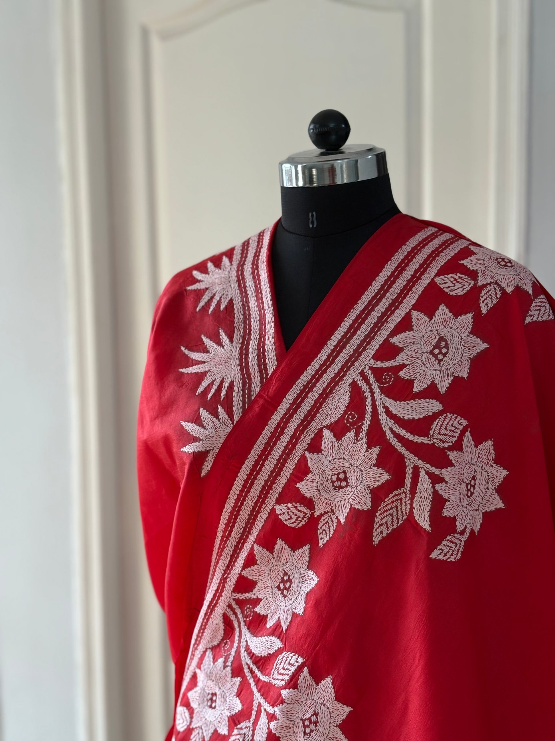 Kantha Stitch Hand Embroidered Pure Banglore Silk Saree (Silk Marked)