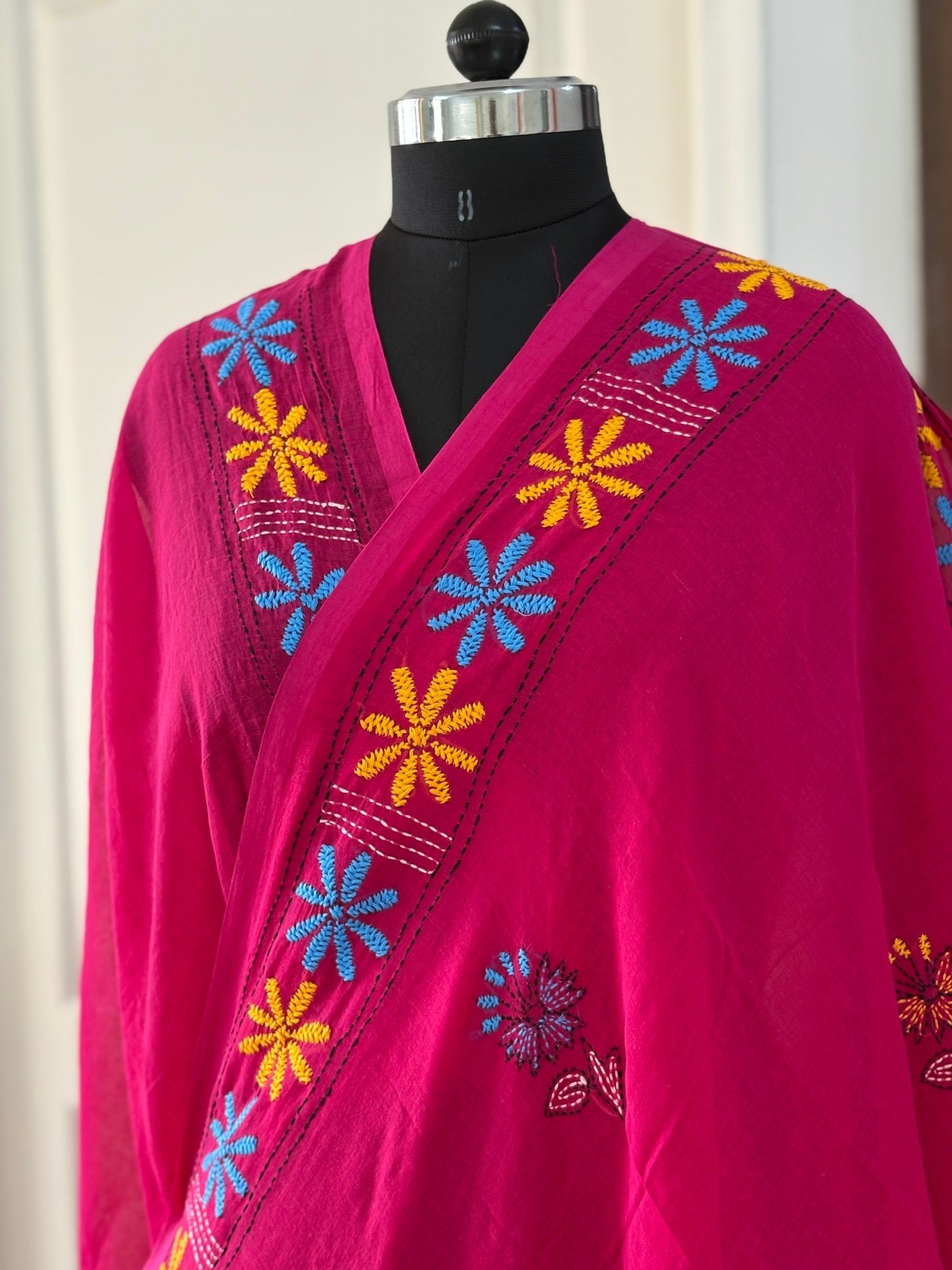Kantha stitch Hand Embroidered Pure mul Cotton Saree