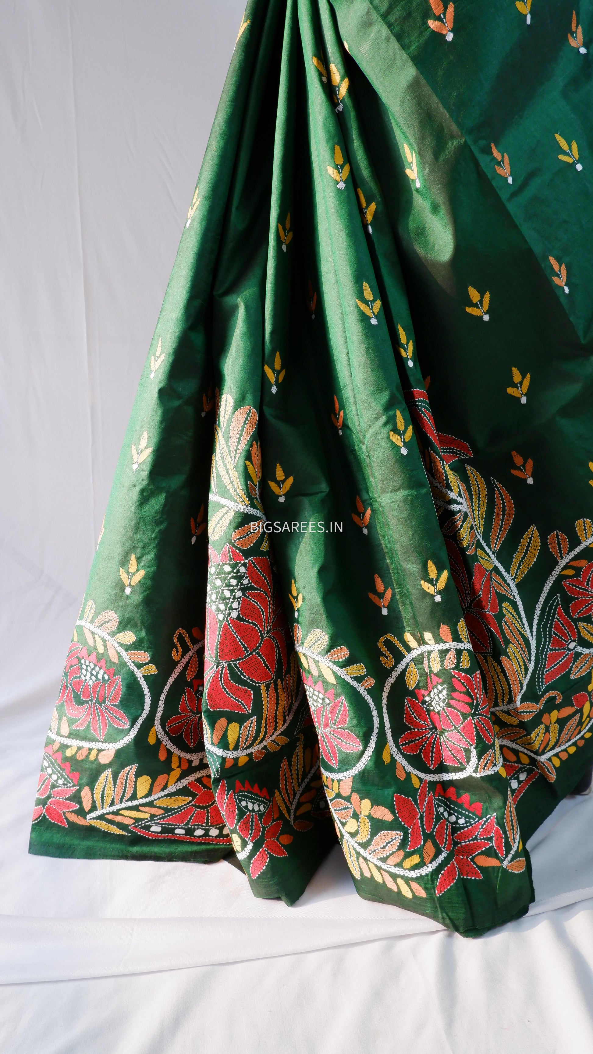 Kantha - Stitch Hand Embroidered Saree | Pure Bangalore Silk | Silk Mark Certified | Forest Green