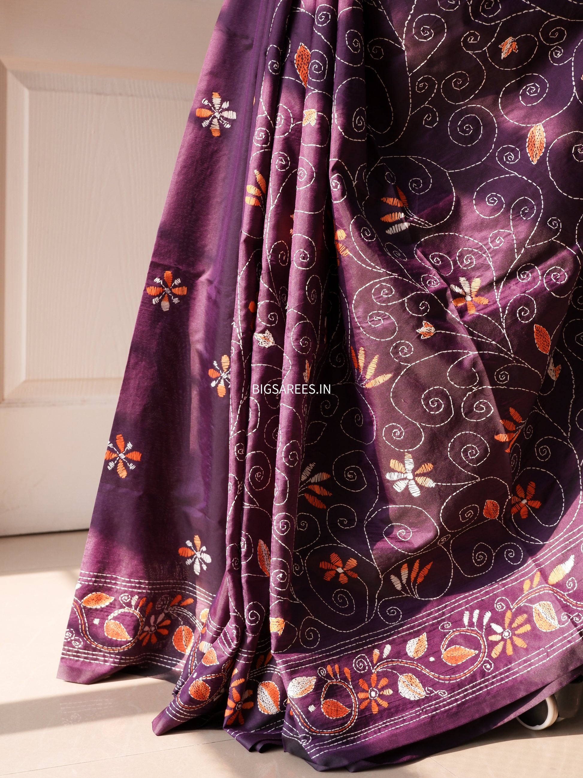 Kantha Stitch Hand Work Embroidered Art Silk Saree With Blouse