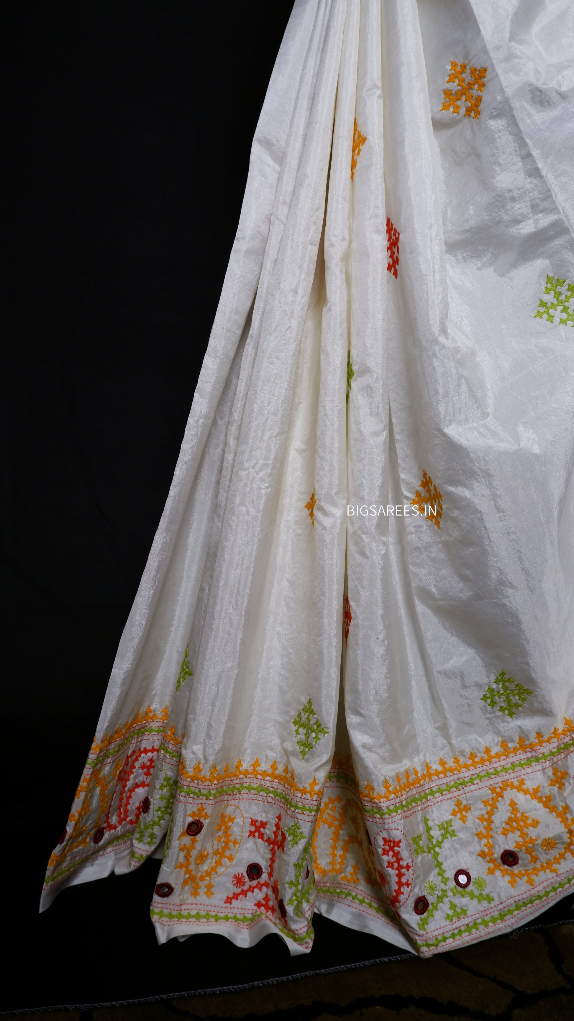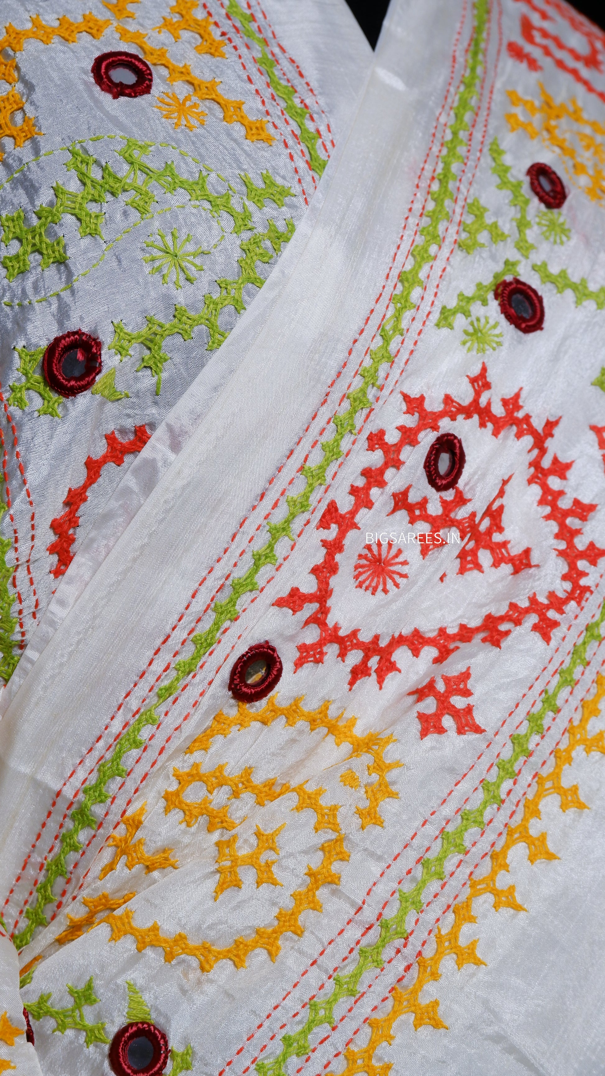 Heavy real mirror work Gujrati Stitch/Kutchi Bharat/Sindhi Hand Embroidered Art Silk Saree with blouse - off white