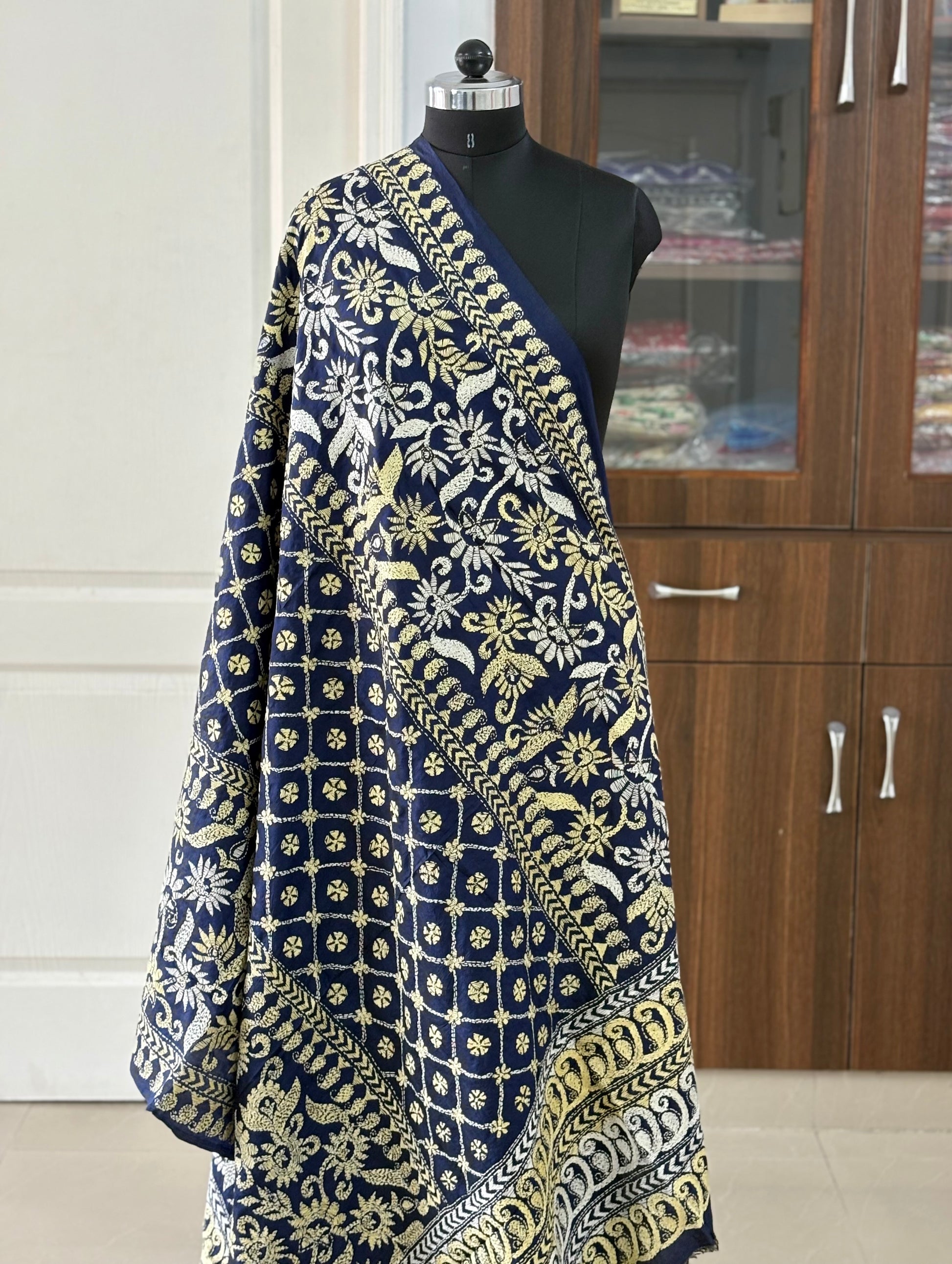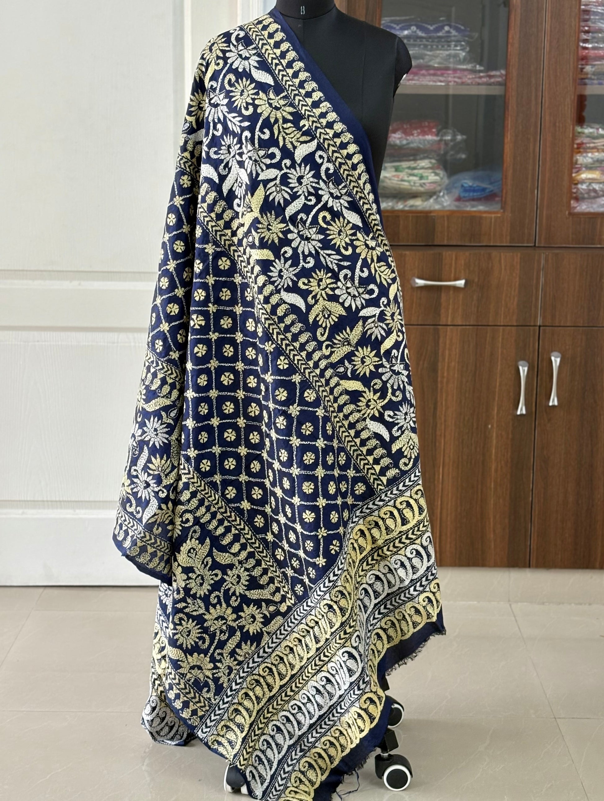 Kantha Stitch Hand Embroidary Full Work Pure Banglore Silk Dupatta - Navy Blue