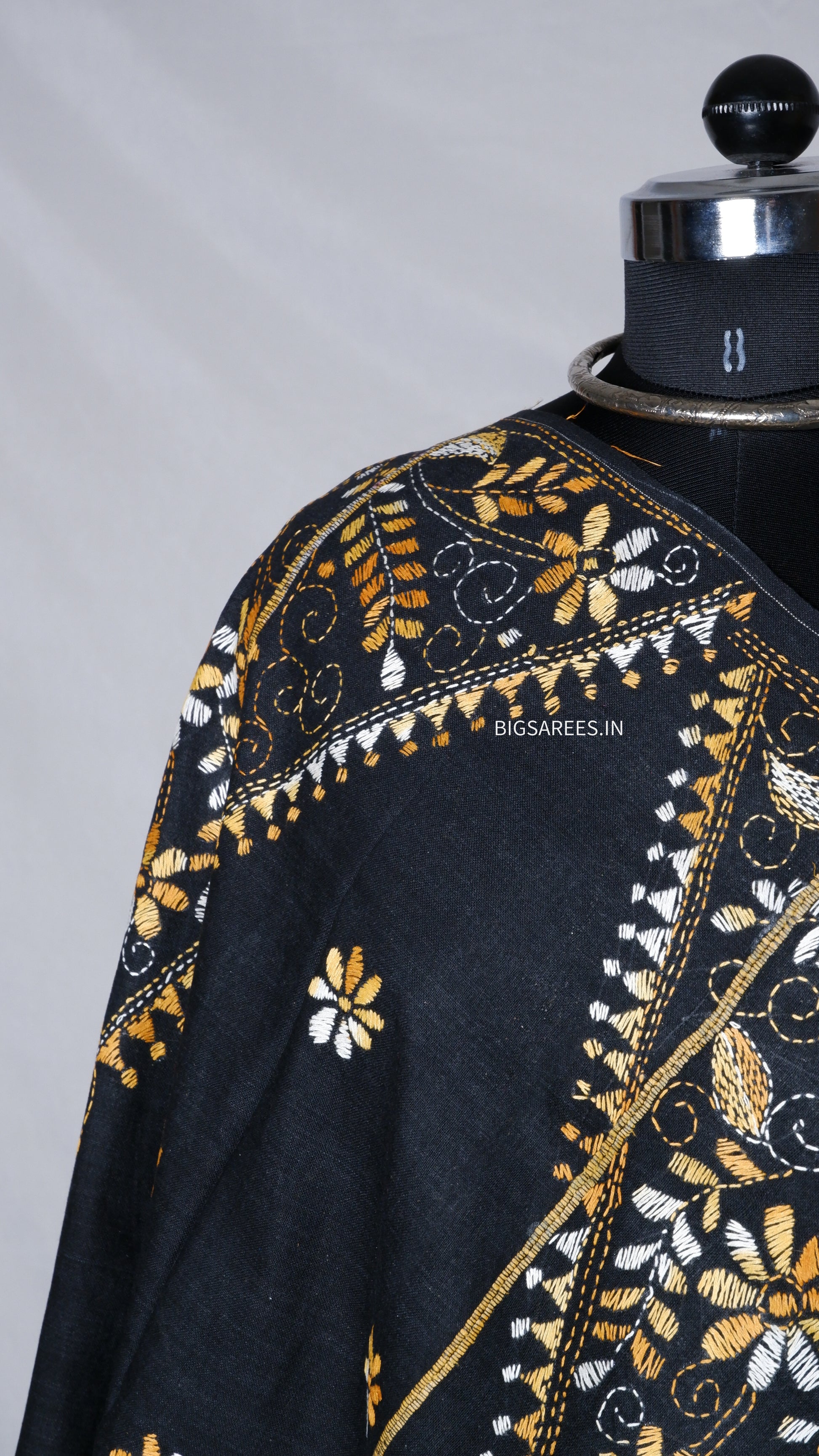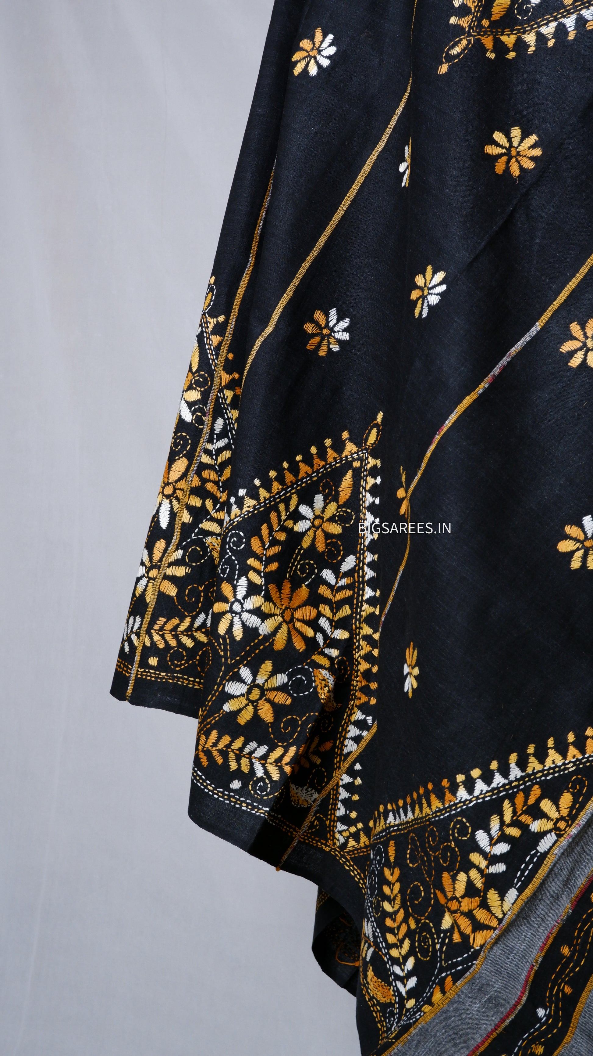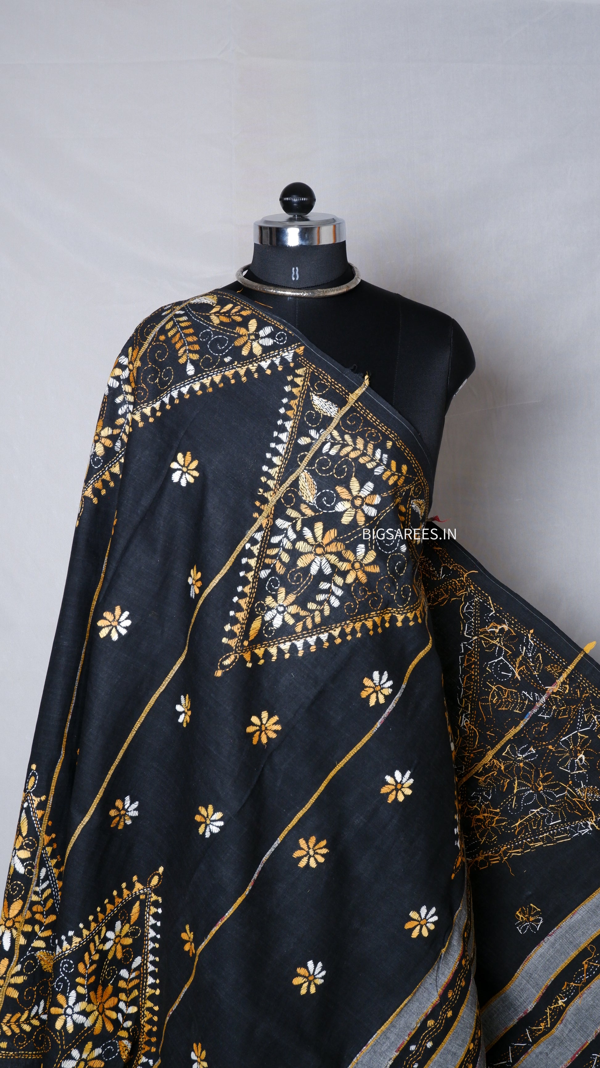 Hand-Embroidered Kantha Dupatta in Pure Khesh Cotton/Black/36"
