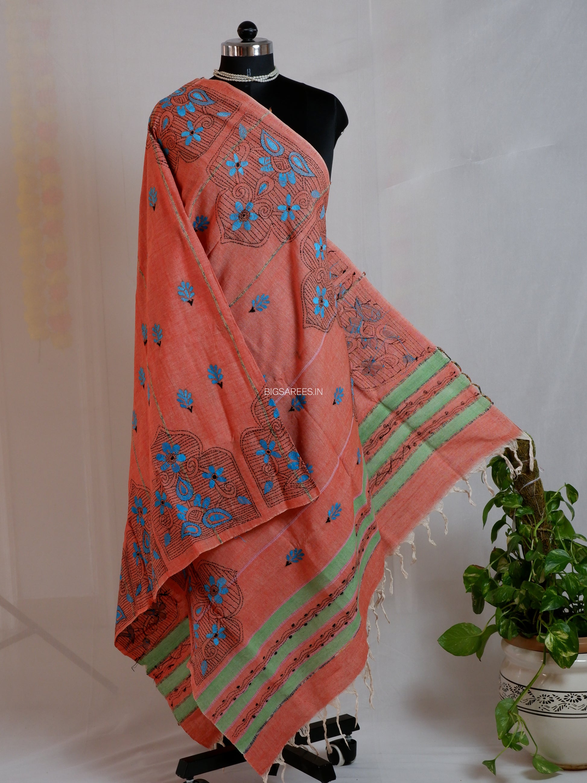 Crafted from pure cotton khesh, this one-of-a-kind, hand-embroidered dupatta is a celebration of mindful making and timeless Bengal craft. The fabric is brought to life with traditional Kantha embroidery, meticulously hand-stitched by skilled artisans where every line and motif carries quiet intention and rhythm.