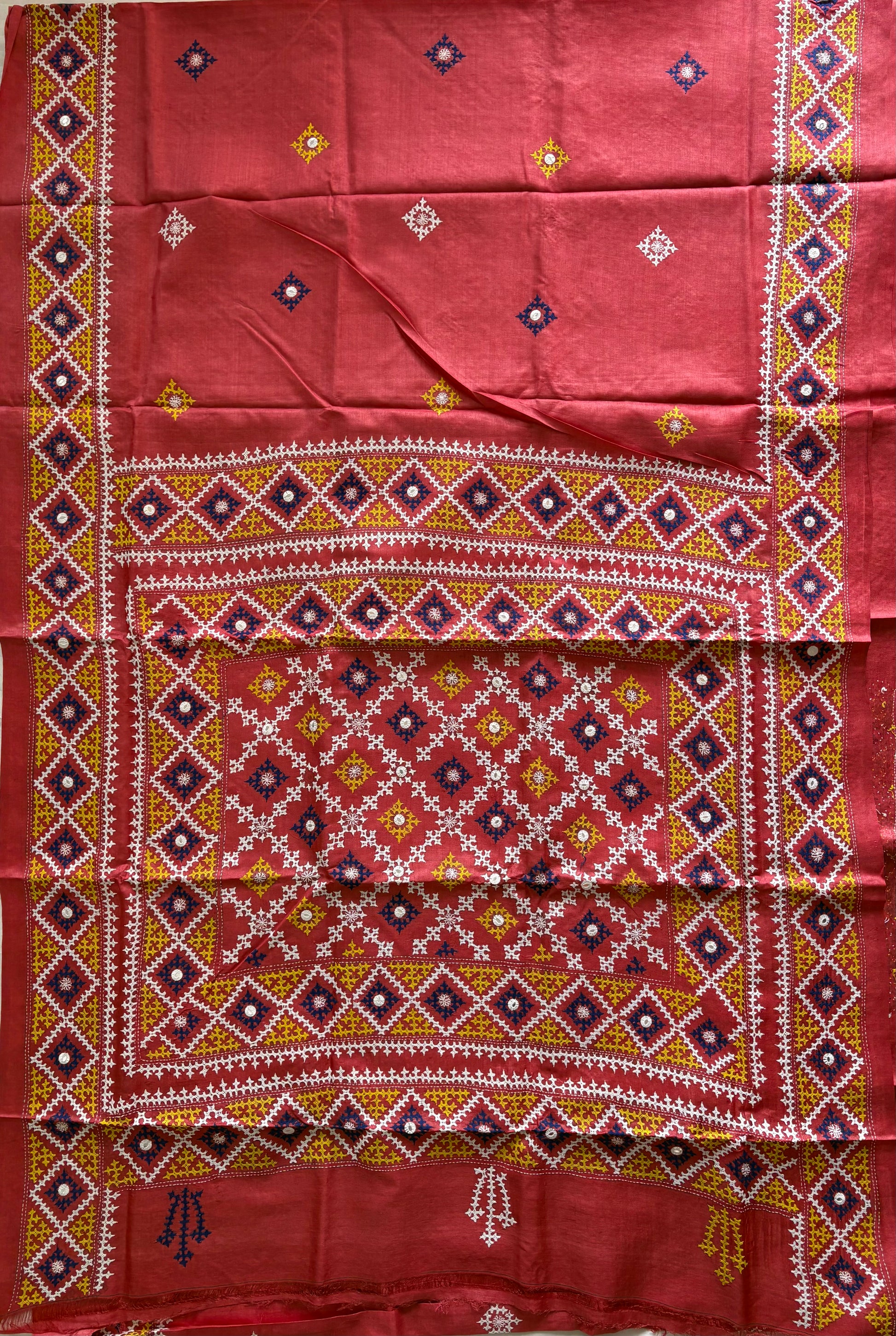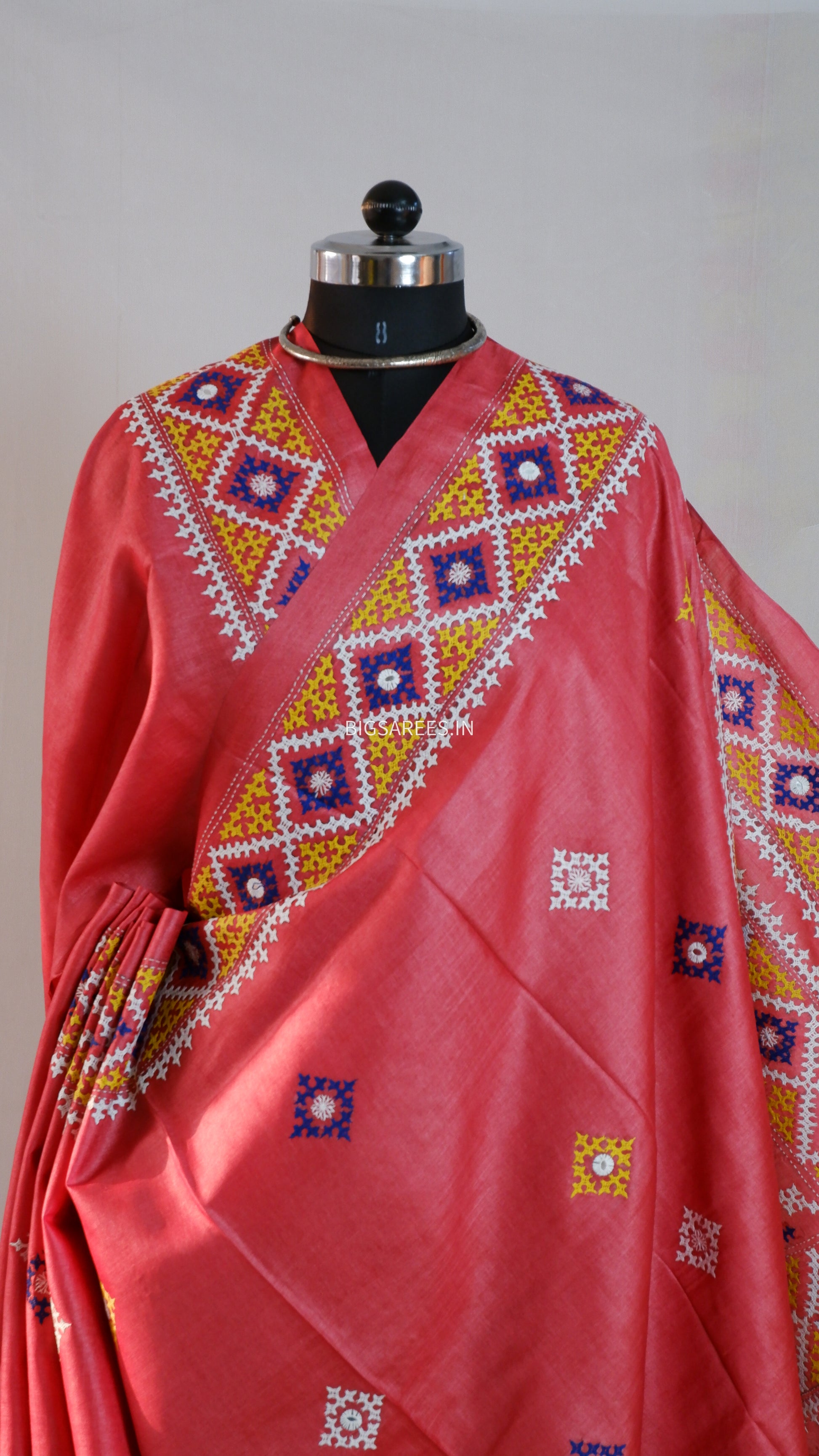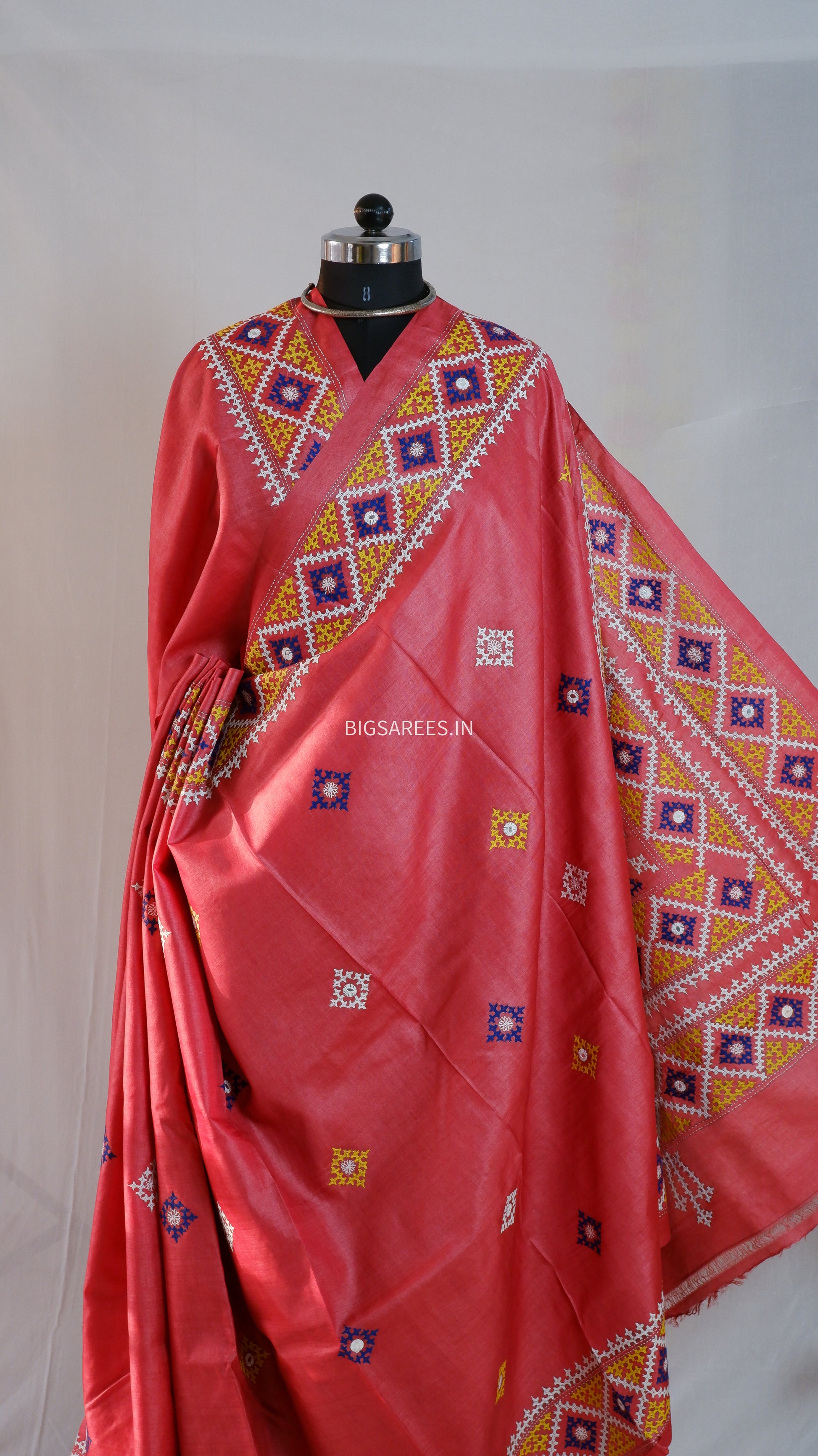 Kutchi Hand Embroidered Saree | Pure Tassar Silk | Silk Marked | Pinkish/Red