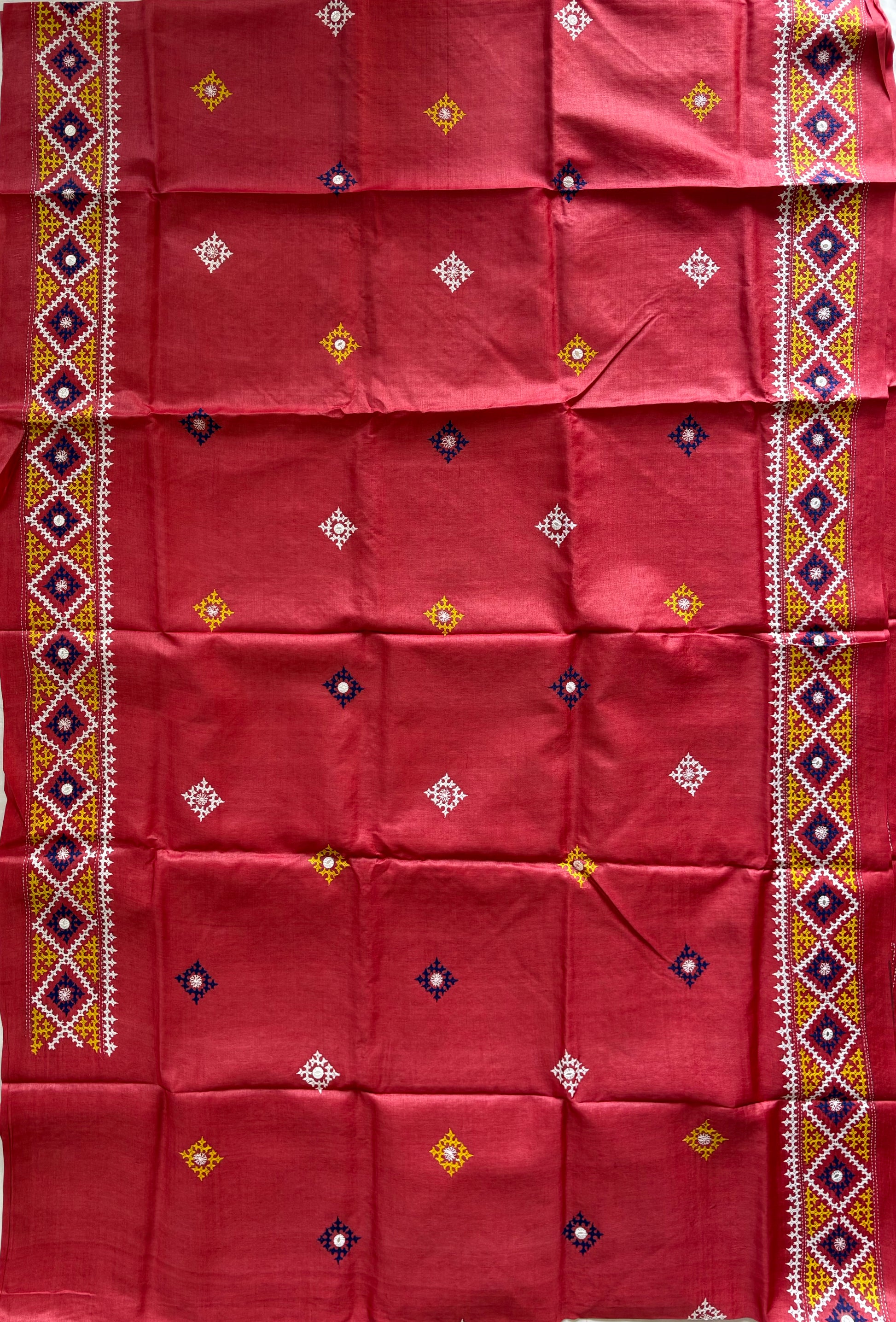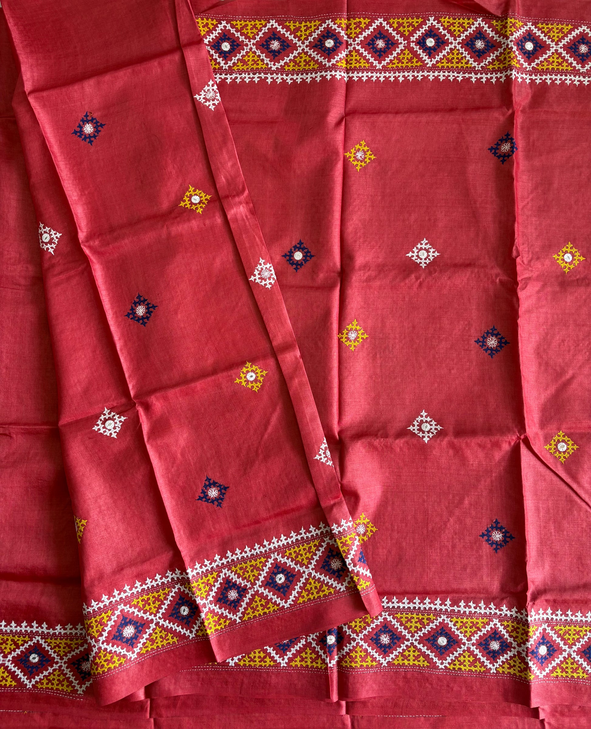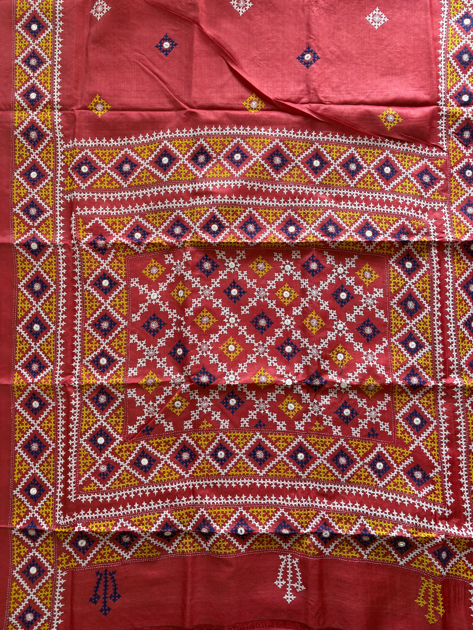 Kutchi Hand Embroidered Saree | Pure Tassar Silk | Silk Marked | Pinkish/Red