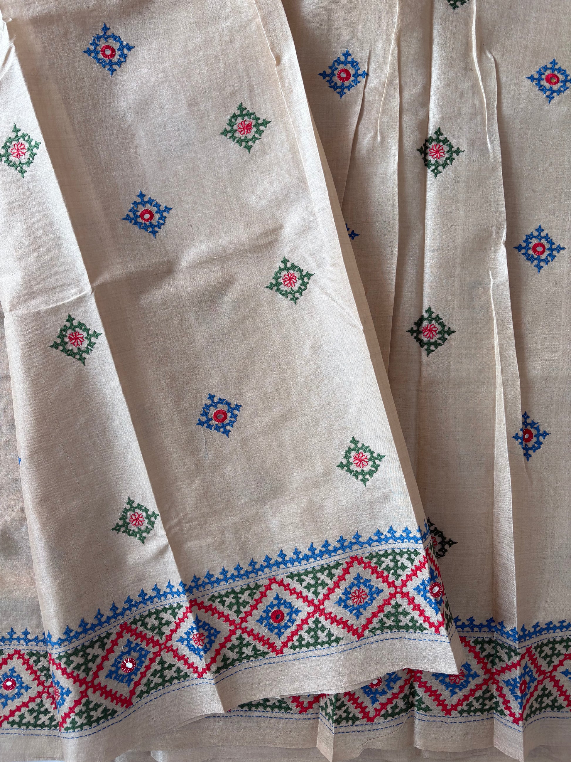 Kutchi Hand Embroidered Saree | Pure Gachi by Gachi Tassar Silk | Silk Marked | Off-White