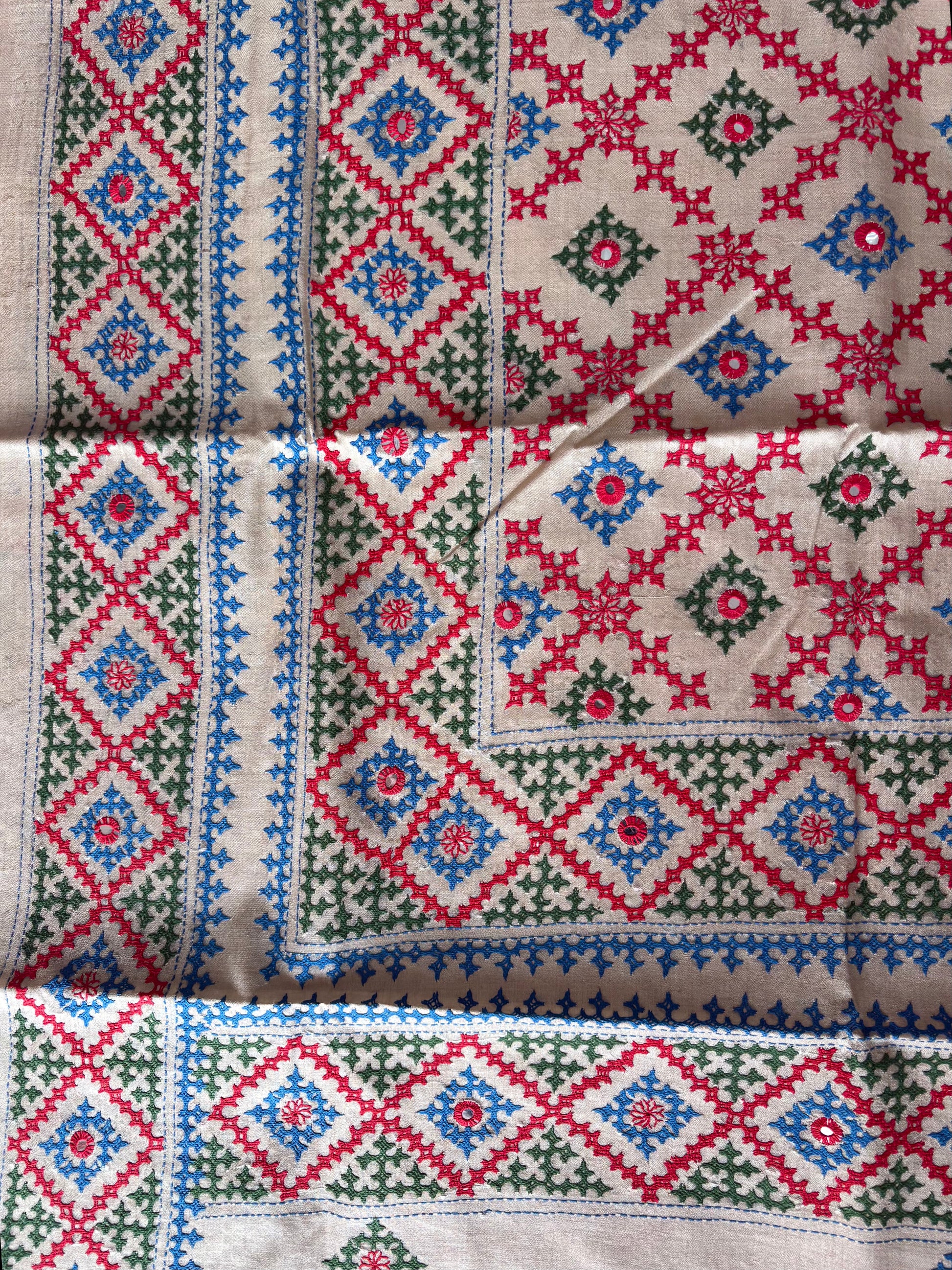 Featuring intricate Kutchi hand embroidery along the border threads used of color Green-Red-Blue and comes with a running blouse, this saree is designed to be cherished for generations. Each piece takes 8–10 months to create, reflecting the patience, skill, and dedication of master artisans.