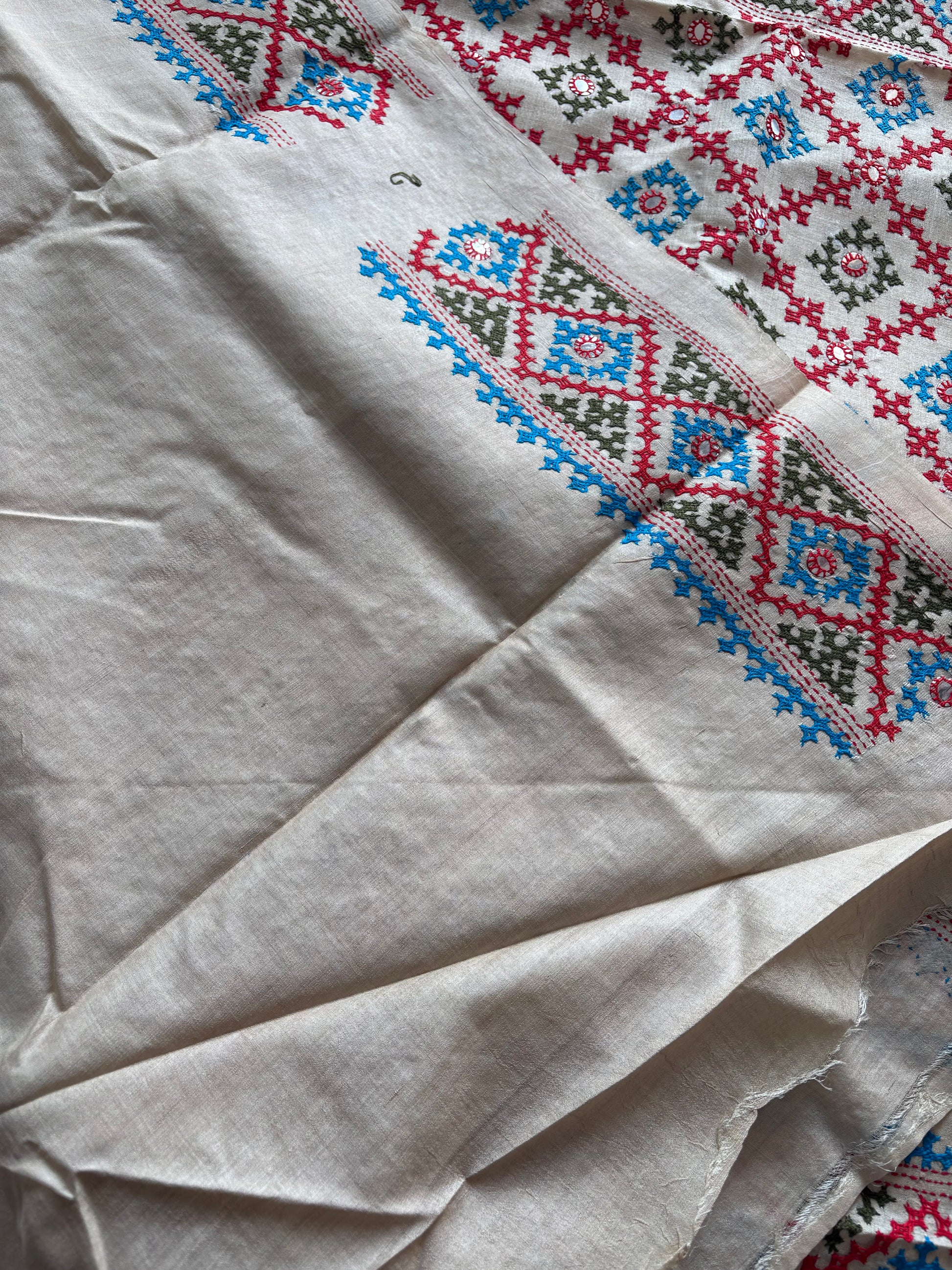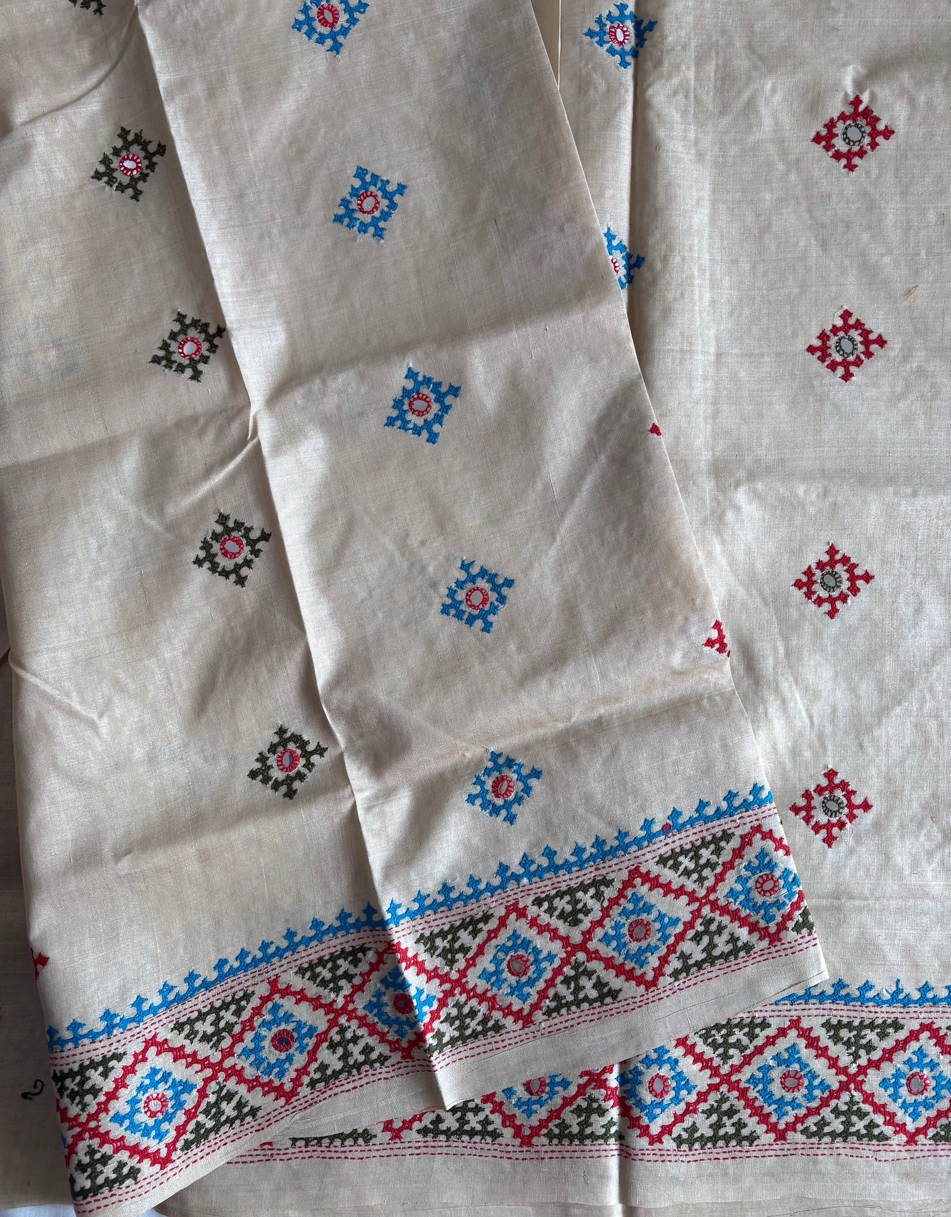 Featuring intricate Kutchi hand embroidery along the border (threads of color - Olive, Blue and Red) and a running blouse, this saree is designed to be cherished for generations. Each piece takes 8–10 months to create, reflecting the patience, skill, and dedication of master artisans.