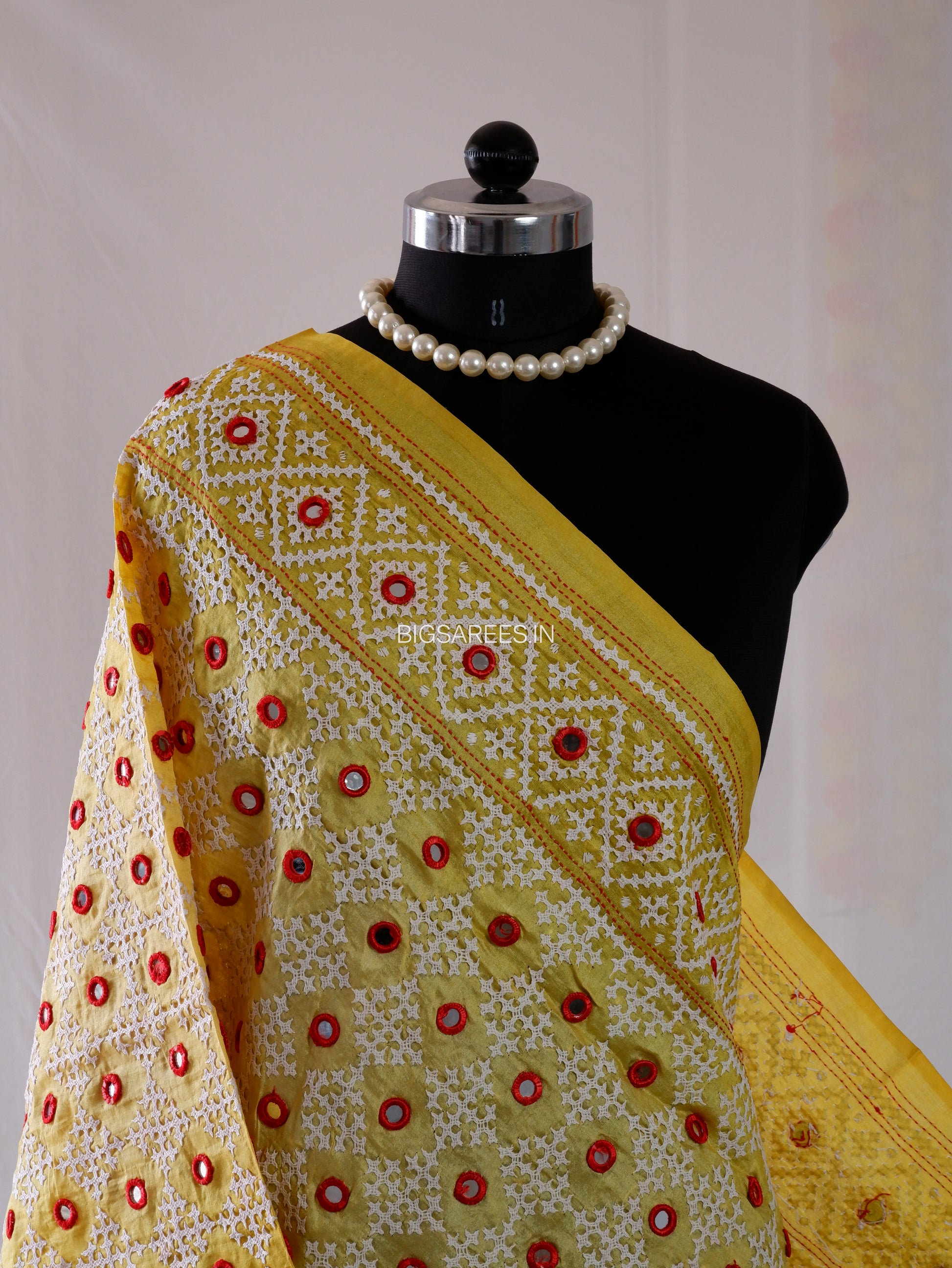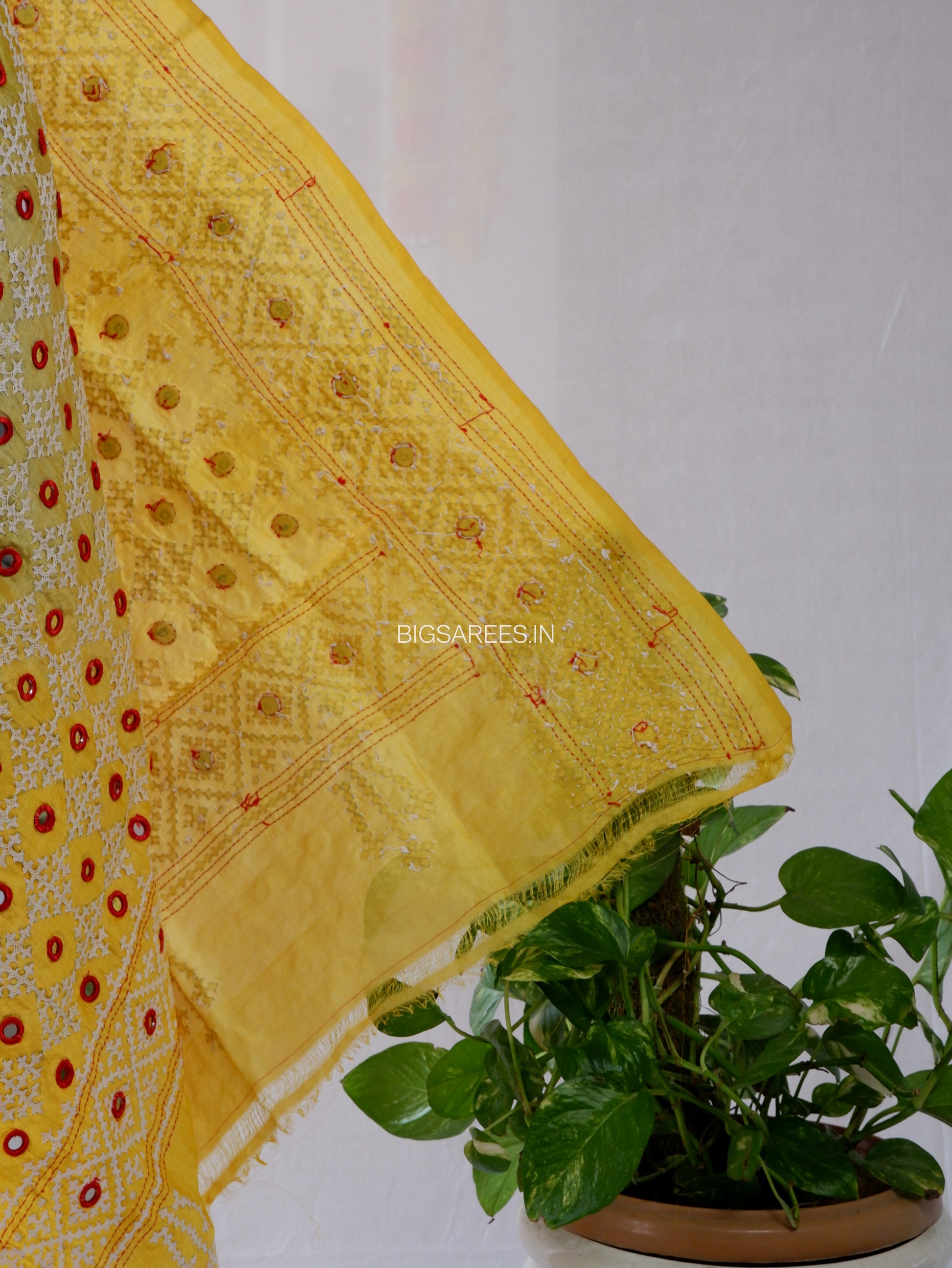 Each mirror is carefully hand-set and surrounded by fine embroidery, creating texture, depth, and a striking festive appeal. The luminous yellow silk paired with bold red accents gives the dupatta a joyful, statement presence.