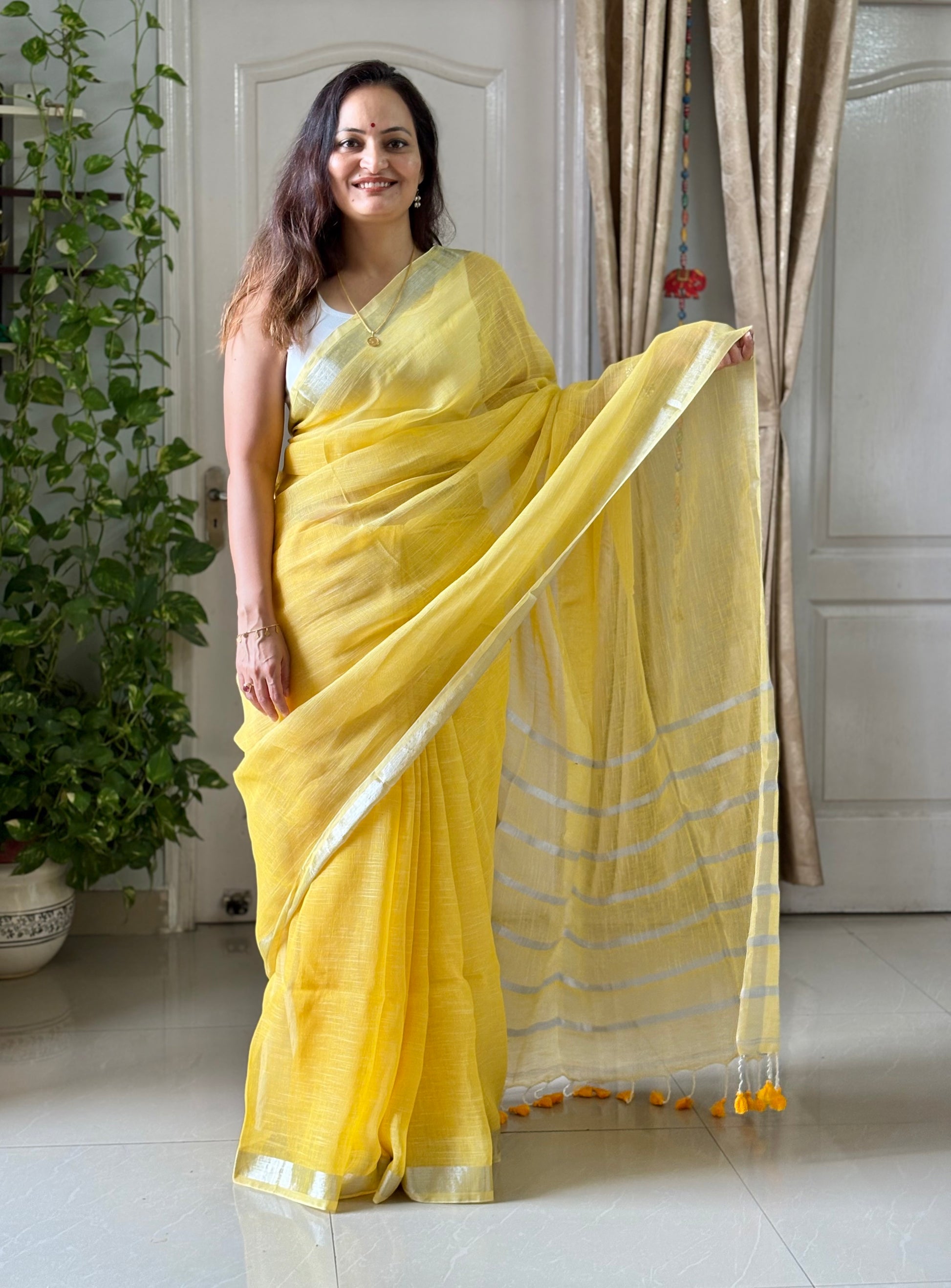 “Beautiful, Linen By Linen Saree With Blouse. Pallu Accessorized With Beautiful Tassels.
