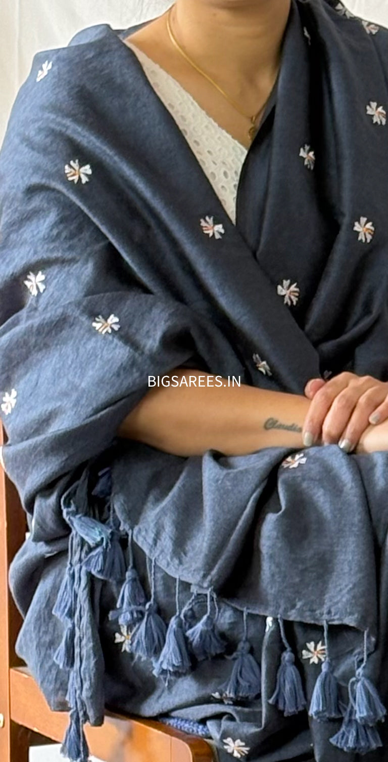 Night Jasmine Motif Saree With Blouse | Acrylic Cotton Blend | Blue Grey