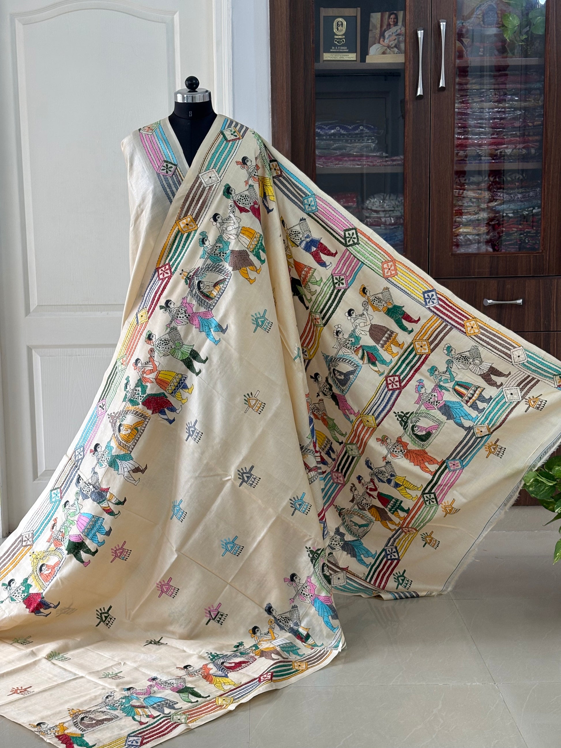 “Off White Kantha Hand Embroidered Pure Tussar Silk Saree (Silk Marked)”