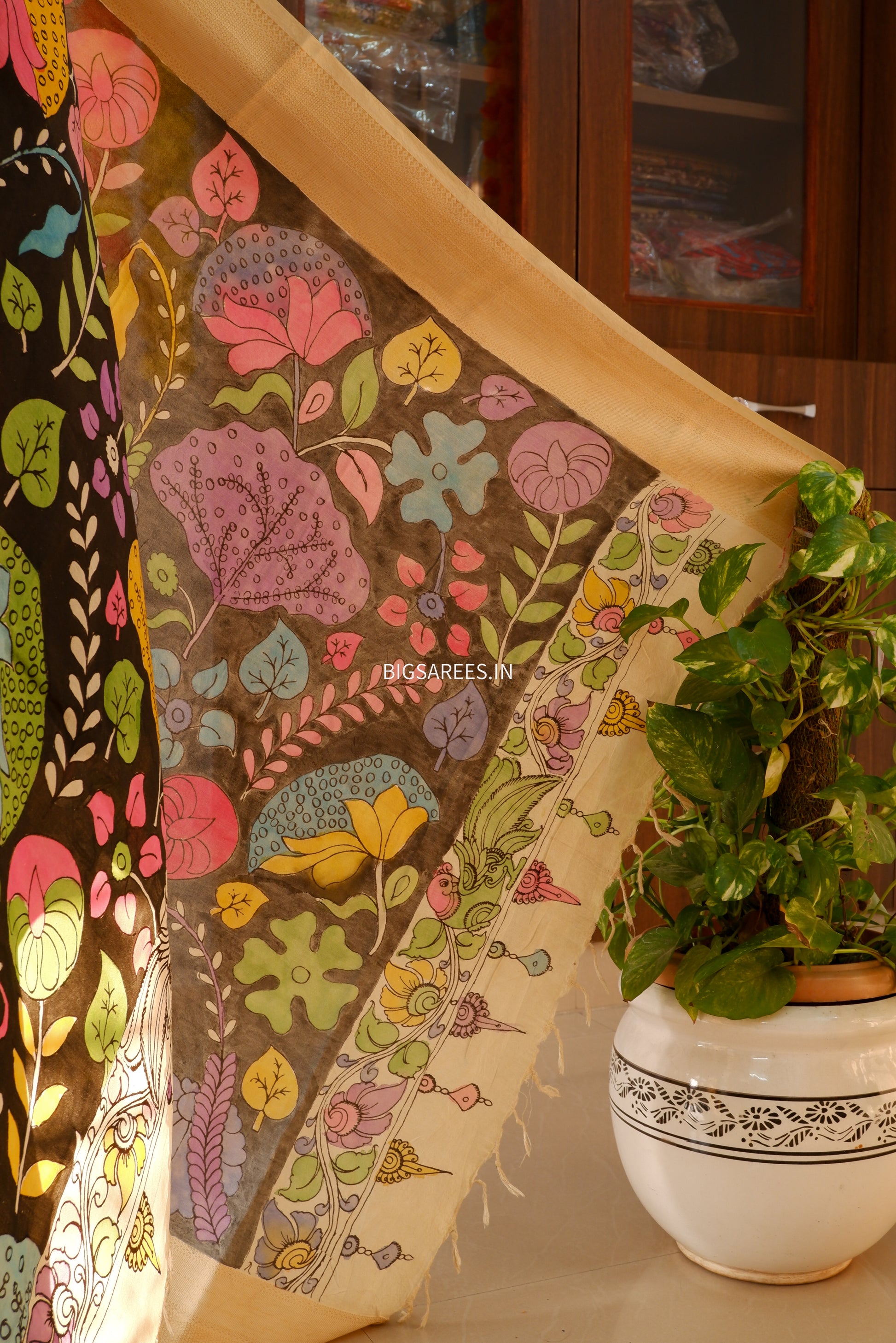 This Pen Kalamkari dupatta on Bangalore silk is a refined expression of hand-painted artistry rooted in tradition. Each motif is carefully drawn using a traditional kalam (pen), making every piece one of a kind.