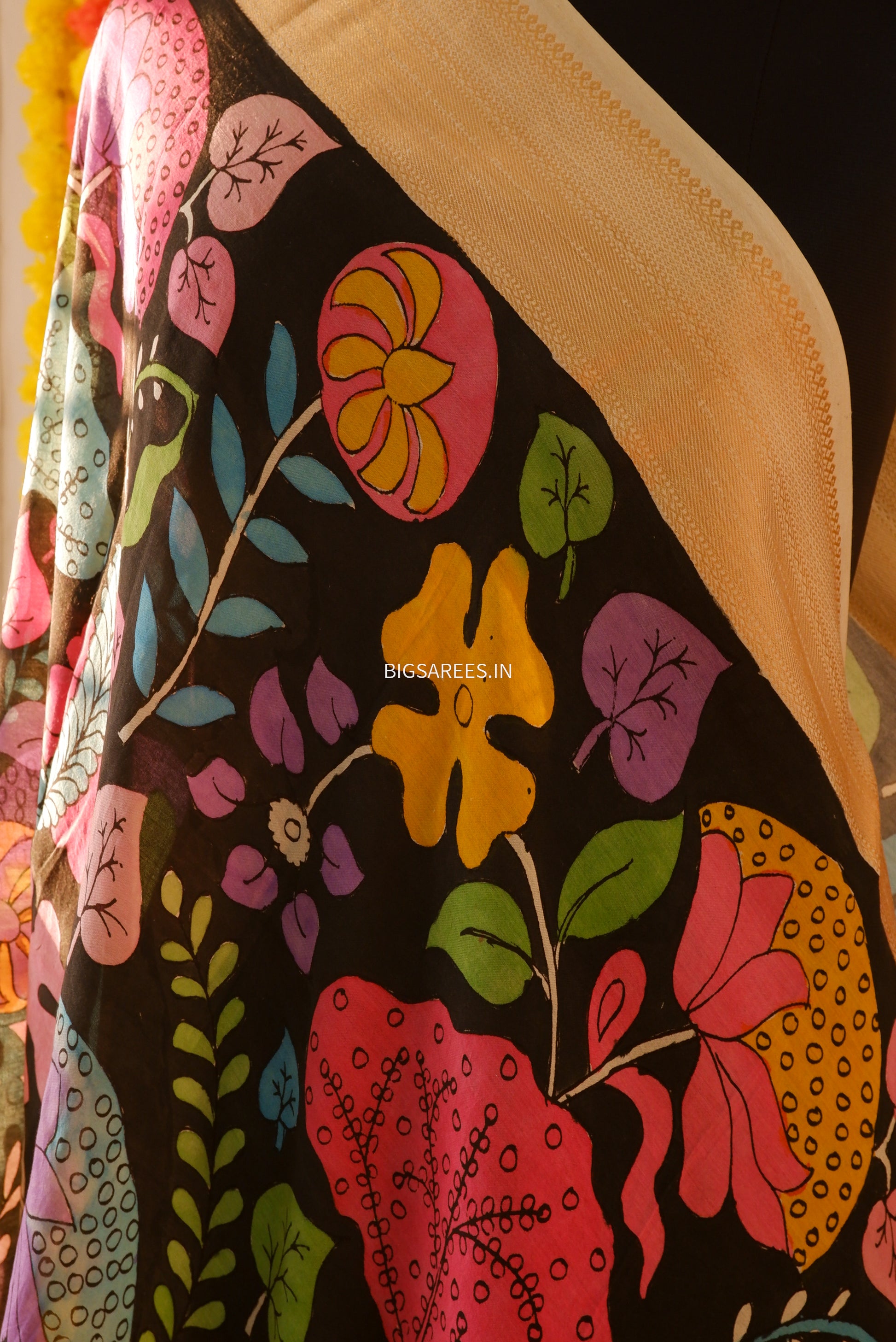 Pen Kalamkari Hand Painted Bangalore Silk Dupatta/Black/36"