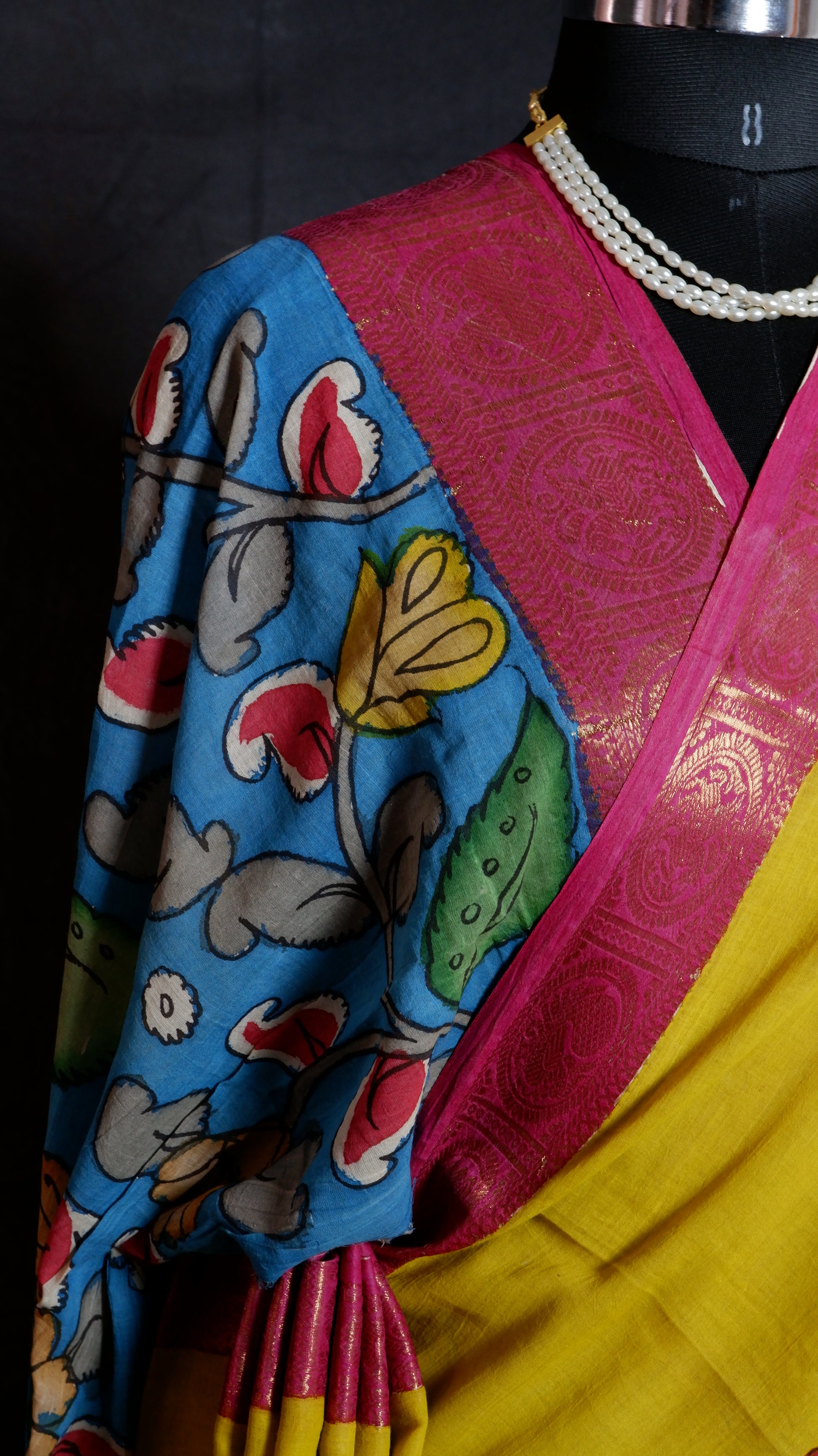 “Pen Kalamkari hand painted pure cotton Saree with hand painted Kalamkari blouse”