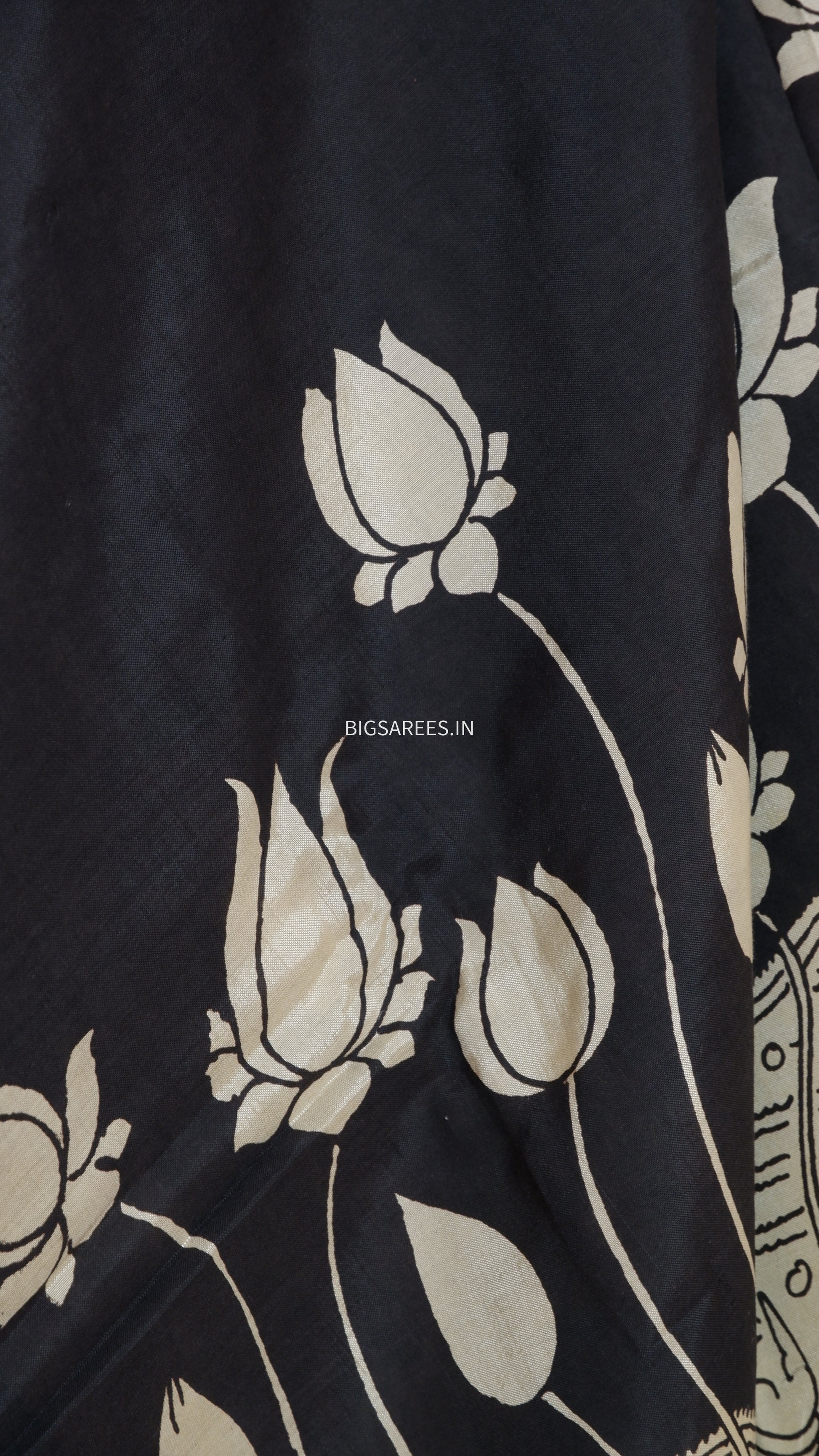 The smooth texture and subtle sheen of Bangalore silk lend depth and elegance to the hand-painted artwork, allowing the motifs to flow naturally across the body of the saree. The thoughtfully detailed pallu adds balance to the overall composition, creating a drape that feels both refined and rooted in tradition.