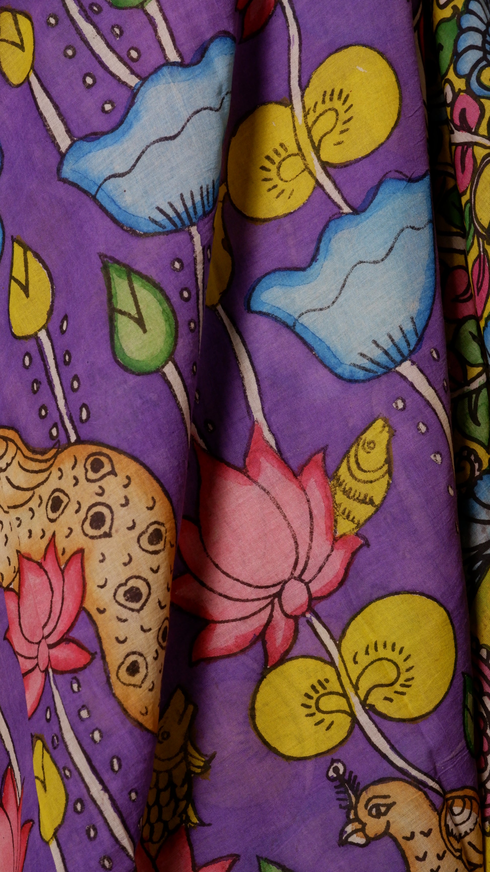 This is authentic hand drawn traditional pen Kalamkari Sarees on pure cotton fabric.