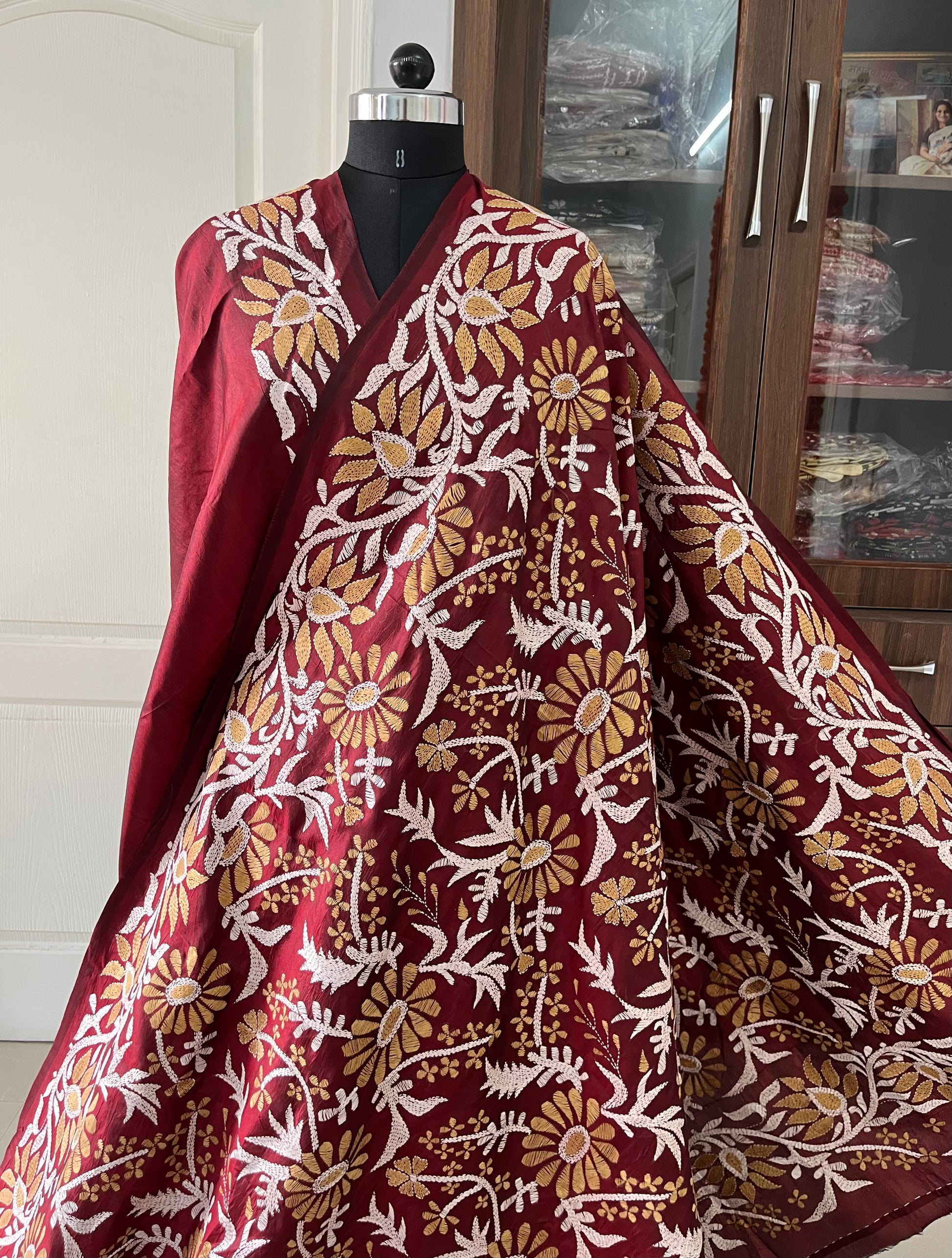 “Maroon Kantha Stitch Hand Embroidered Full Work Pure Banglore Silk Saree With Blouse. Silk Mark Certified”