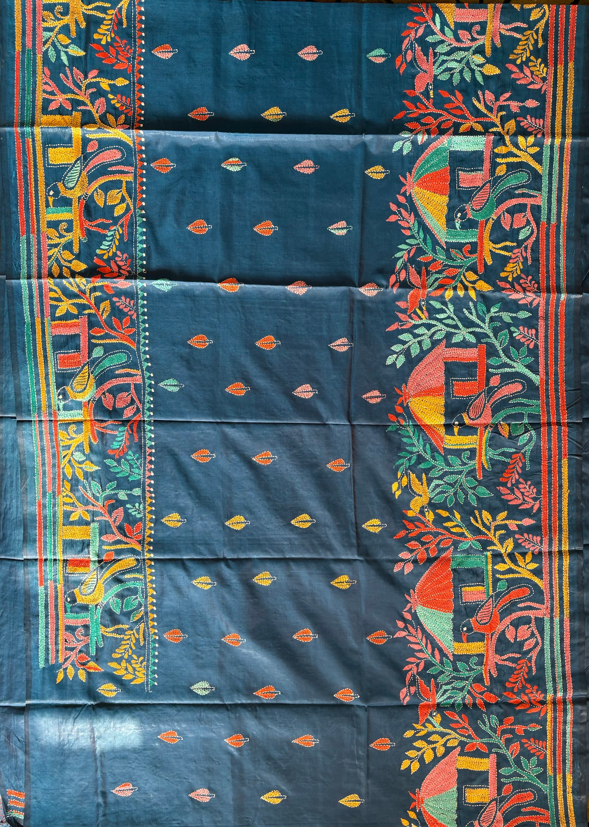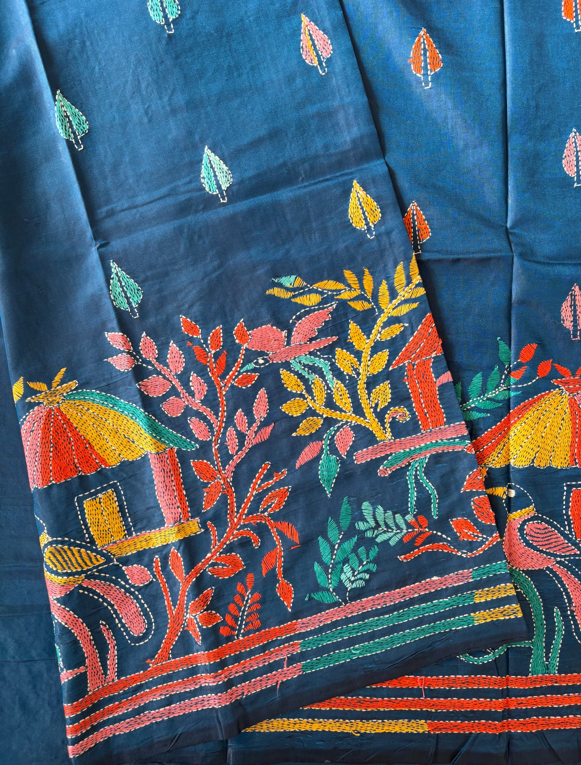 Kantha Stitch Hand Embroidered Art Silk Saree With Blouse