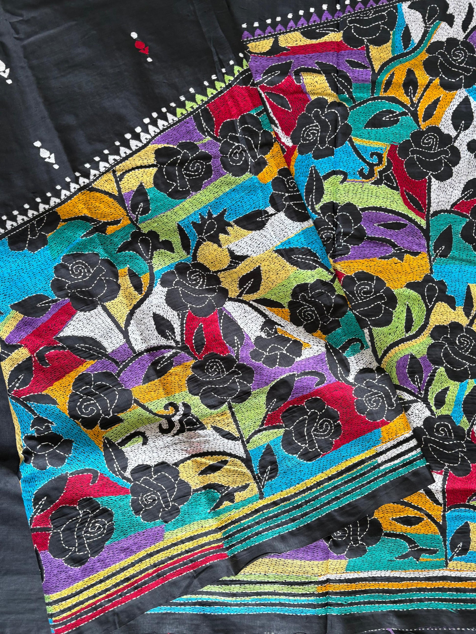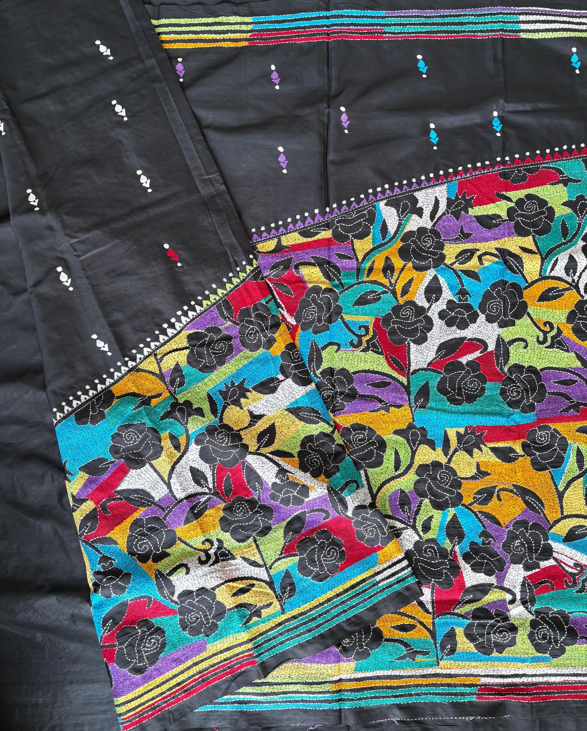 Reverse Kantha Stitch Hand Embroidered Art Silk Saree With Blouse