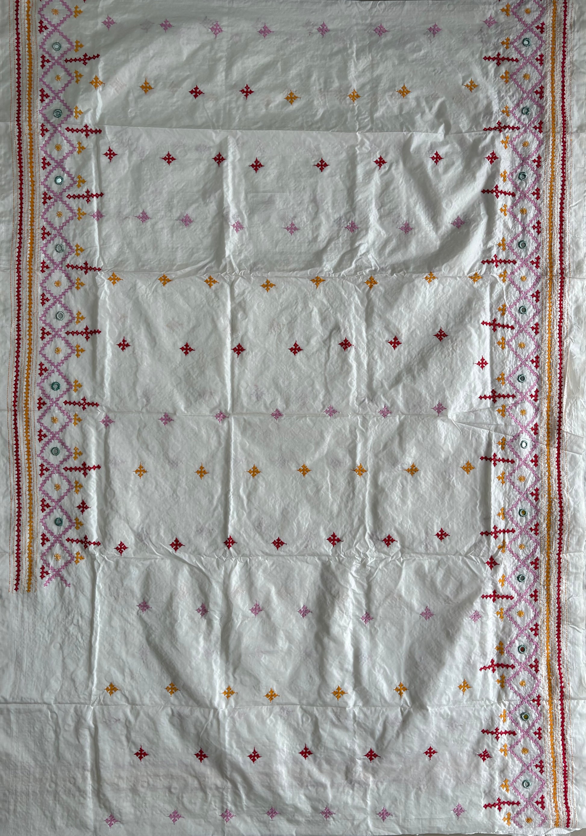 Heavy real mirror work Gujrati Stitch/Kutchi Bharat/Sindhi Hand Embroidered Art Silk Saree with blouse - white